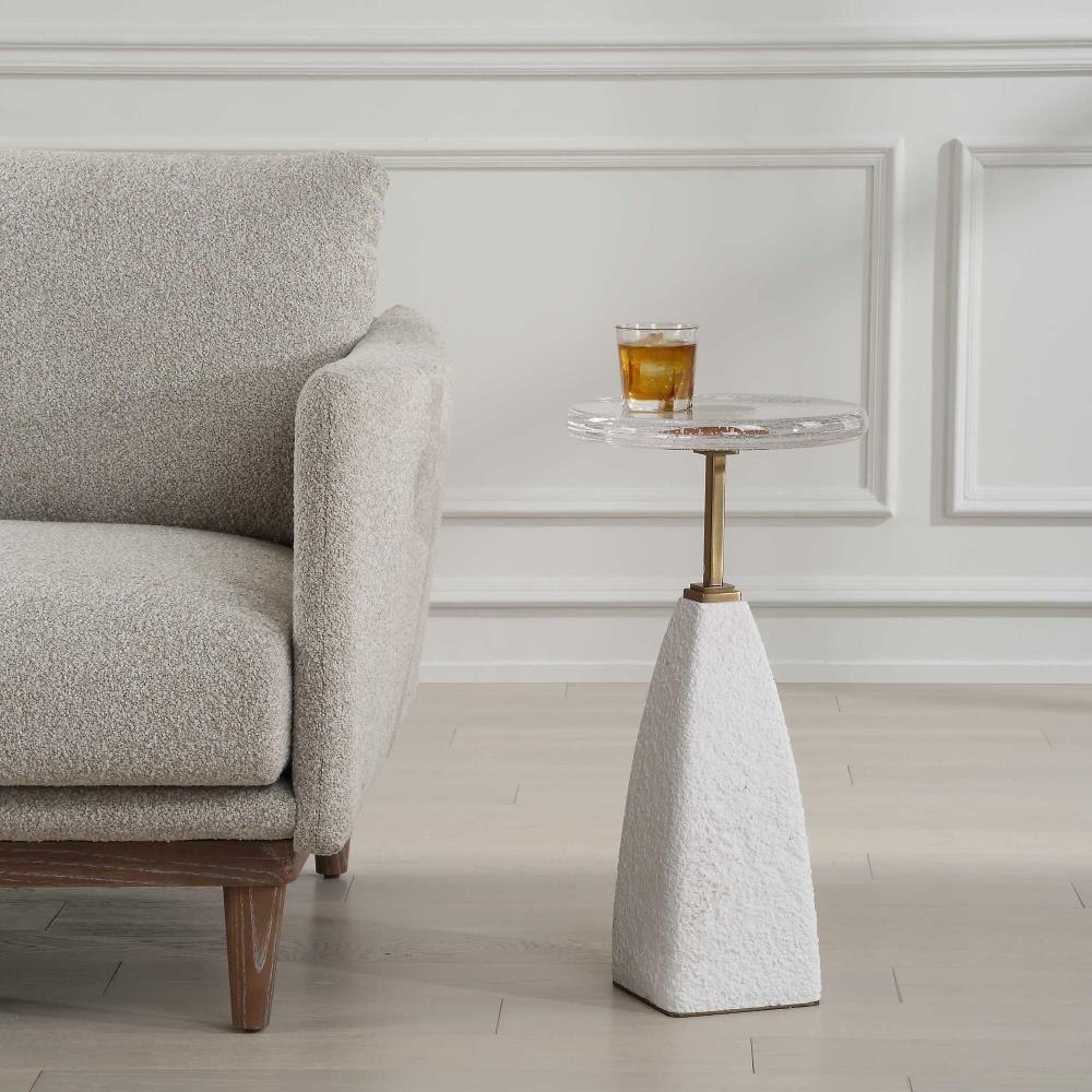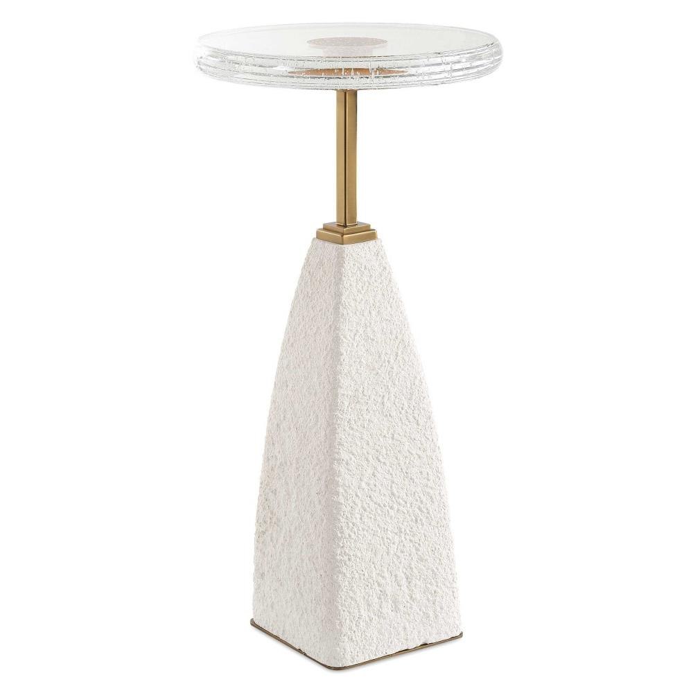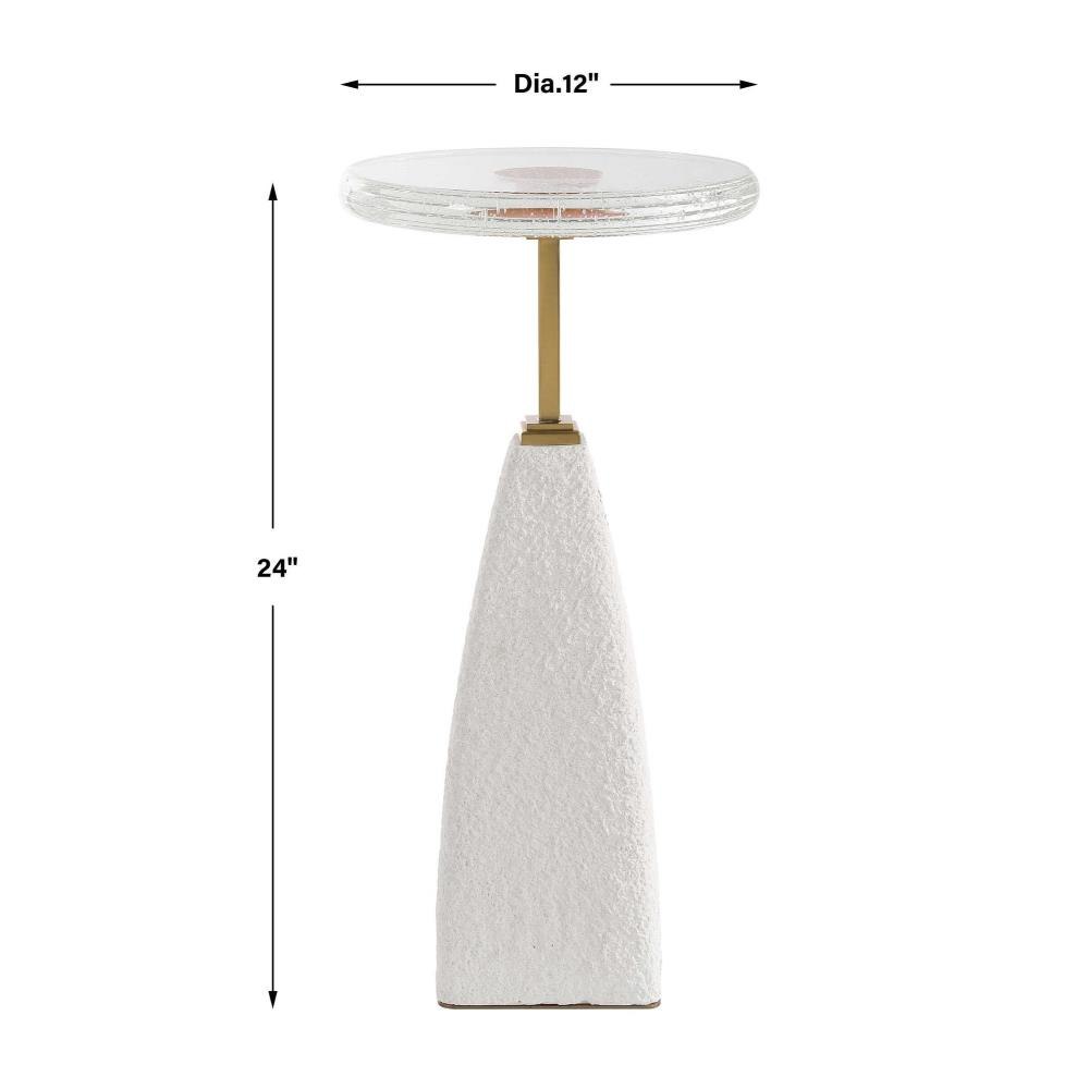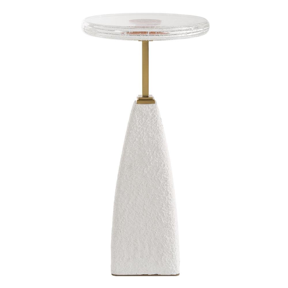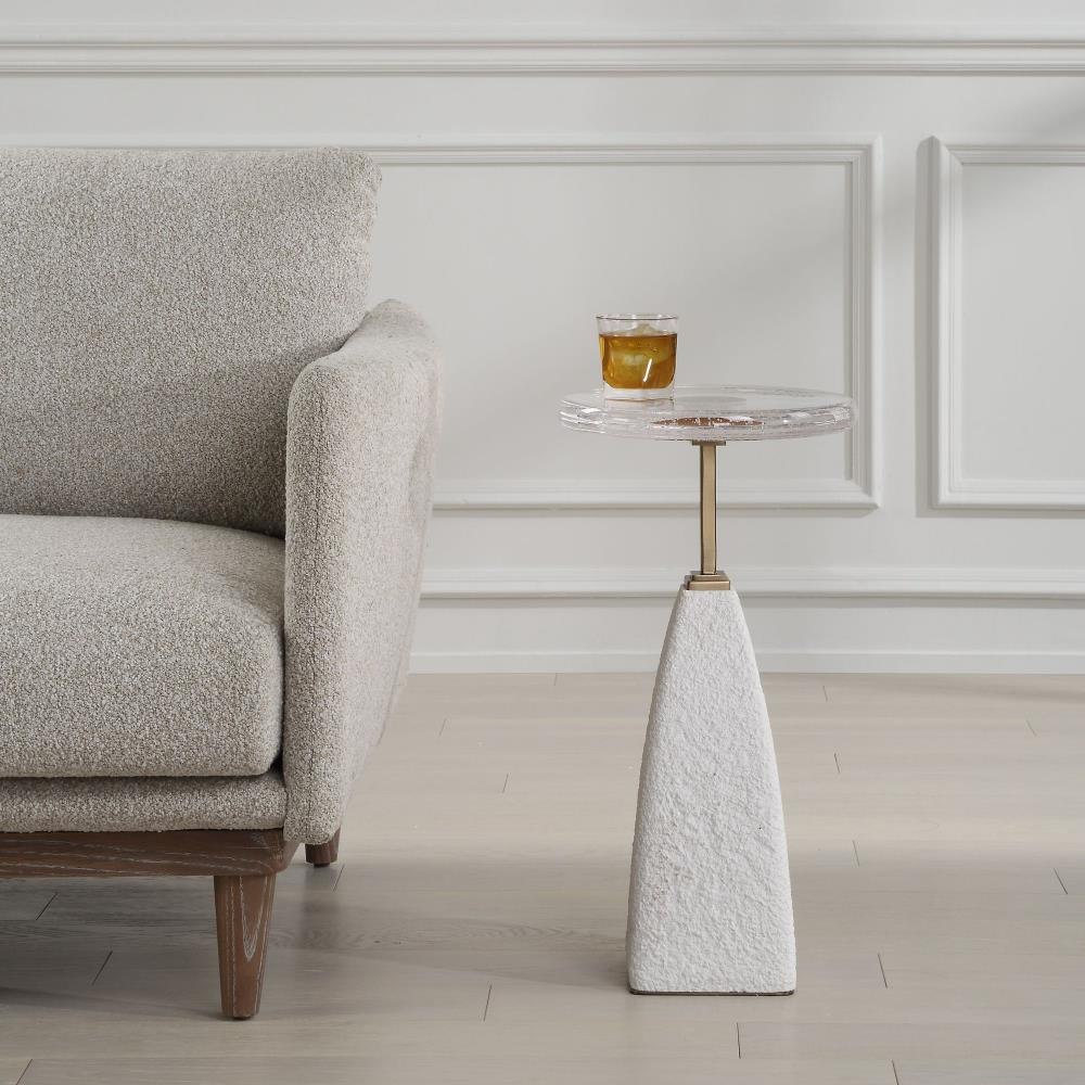 The Sora Drink Table Features A Thick Seeded Glass Top With A Complimenting White Sandstone Base And Brushed Brass Stainless Steel Accents.