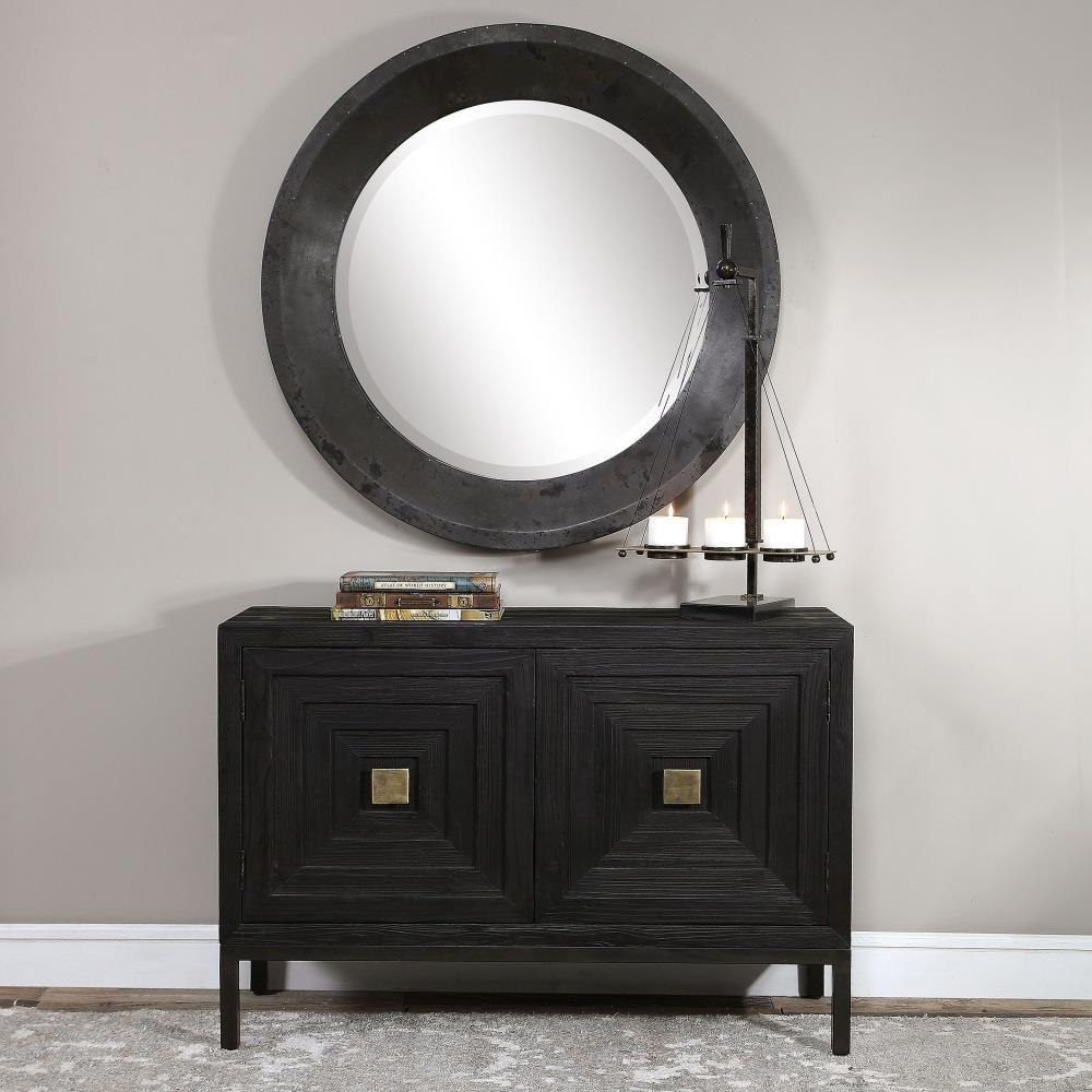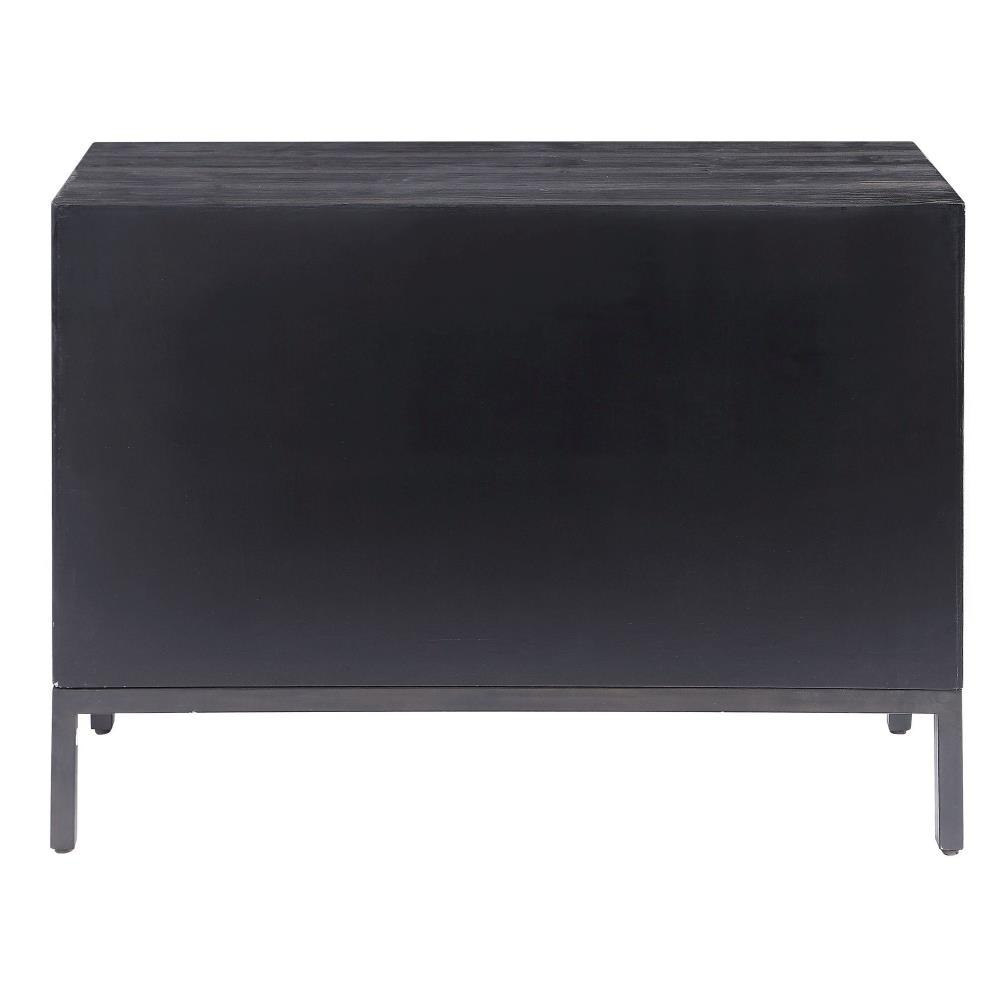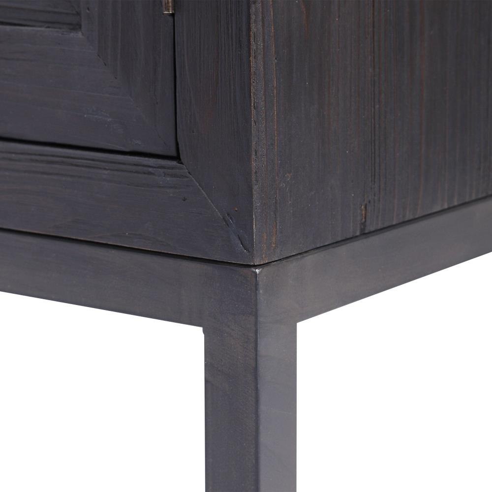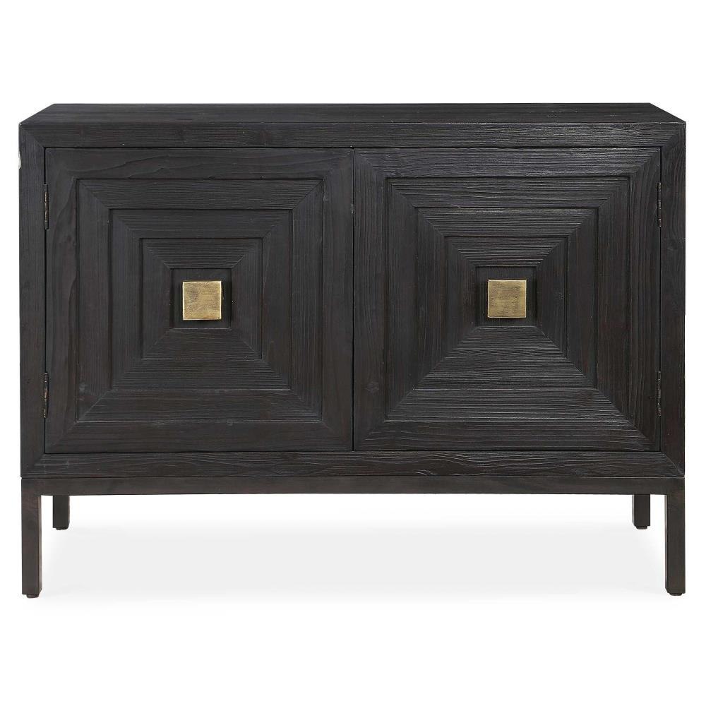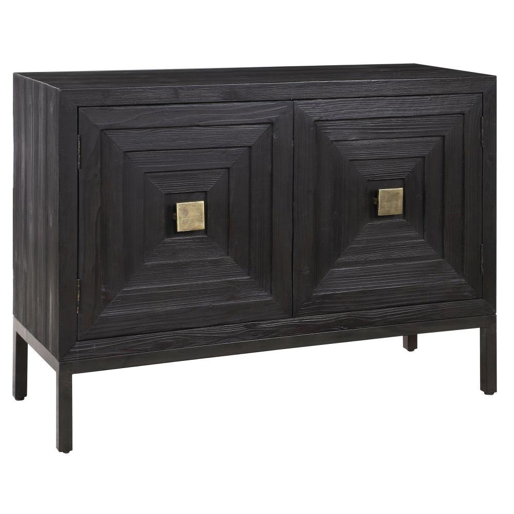 A Contemporary Geometric 2 Door Accent Cabinet, Constructed From Deeply Grained Fir Wood Finished In A Dark Ebony Stain, Accented With Brushed Brass Hardware. Has One Fixed Interior Shelf.
