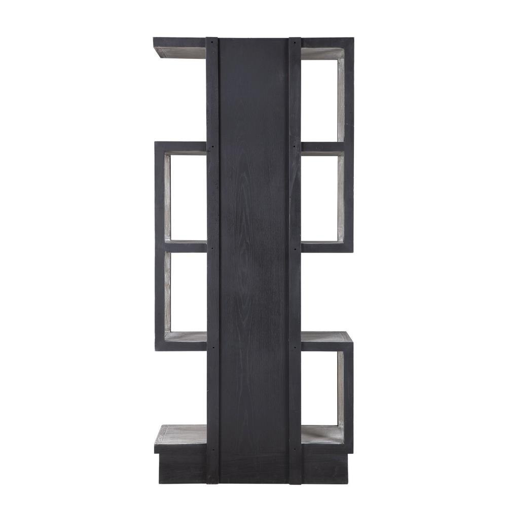 The Dramatic Contrast Of This Asymmetrical Etagere Gives An Updated Contemporary Feel, Featuring Elm Veneer Shelving Finished In Light Gray, Accented With A Deep Black Recessed Panel With A Light Gray Glazing.
