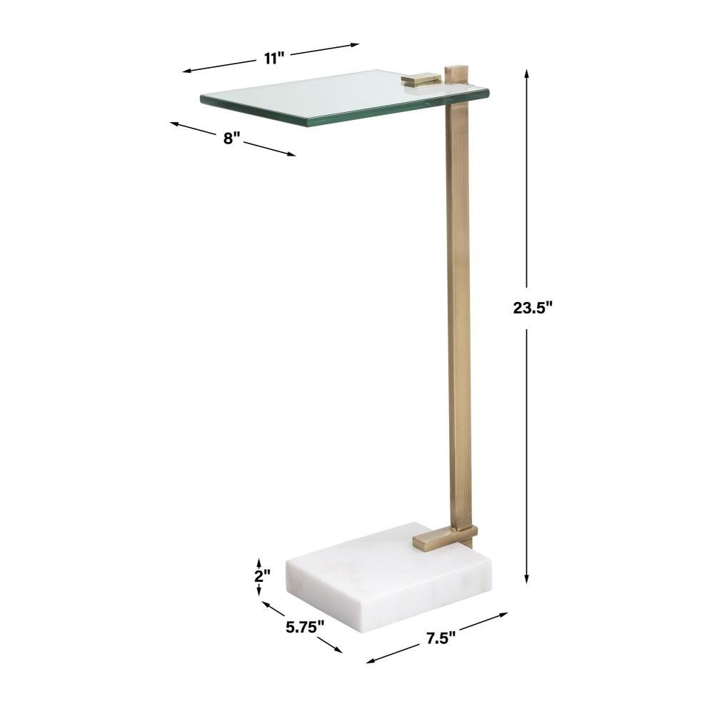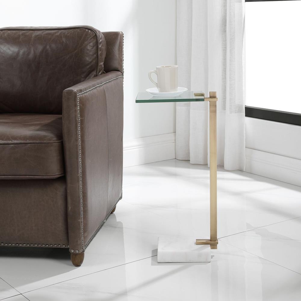 This Perfect Pull-up Table Pairs An Updated Design With Timeless Finishes. The Tempered Glass Top Is Supported By A Brushed Brass Plated Stainless Steel Base Accented By An Elegant White Marble Foot With Natural Veining.