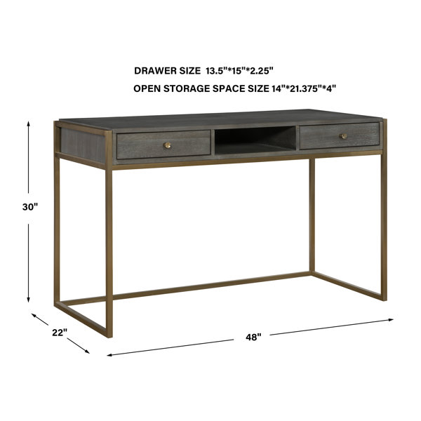 Contemporary In Style, This Writing Desk Features A Sleek Stainless Steel Framework In Plated Brushed Brass. The Top Is Crafted From Acacia Veneer In A Dark Walnut Stain And Light Gray Glaze With Brass Drawer Pulls.