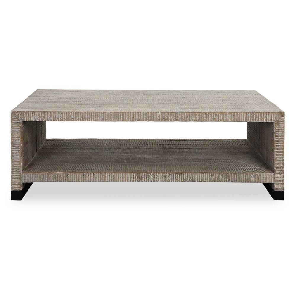 This Casual Coffee Table Provides Ample Display Space And Creates A Rustic Feel With Its Natural Wood Finish And Intricate Carved Details, Highlighted By A White Washed Glaze. Steel Feet Are Finished In A Natural Aged Black.
