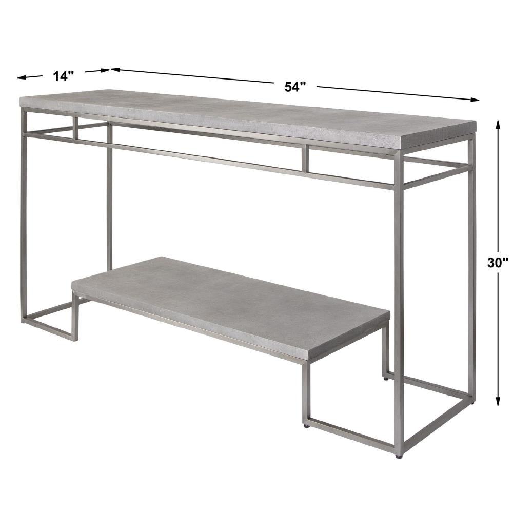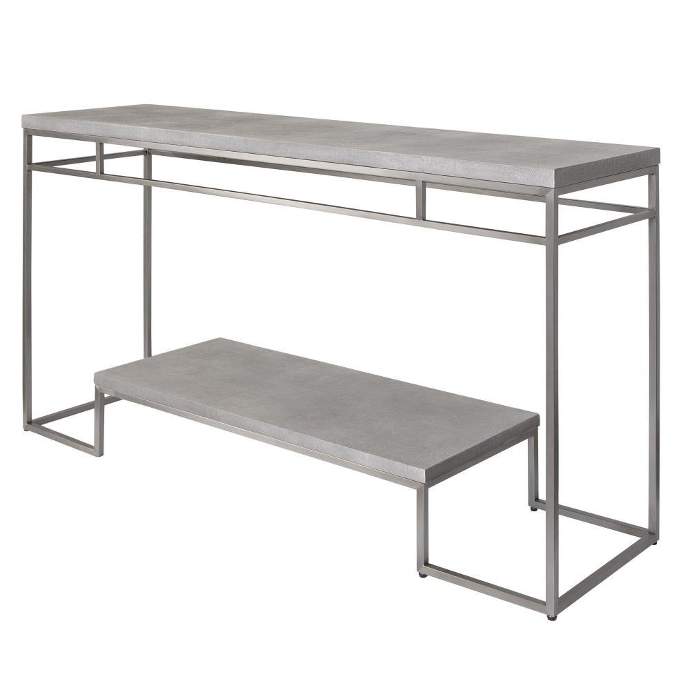 Known For Its Popularity During The Art Deco Period, Shagreen Has Made Its Resurgence As A Modern Home Decor Staple. This Console Features Faux Shagreen Embossed Surfaces In A Natural Light Gray Wash, Paired With A Modern, Stainless Steel Frame Finished In Brushed Nickel.