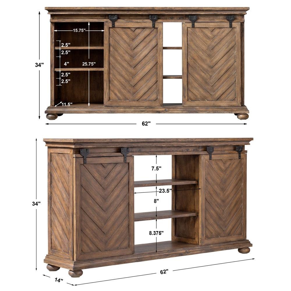 A Craftsman Built Media Piece Finished In Antique Honey Over Mango Veneer, Featuring Chevron Patterned Sliding Doors With Carved Molding Details And A Classic Bun Foot. Aged Black Iron Sliding Hardware Allows For Concealing Or Revealing Multiple Storage Options. Each Side Has Two Adjustable Shelves, With Two Fixed Shelves In The Center.