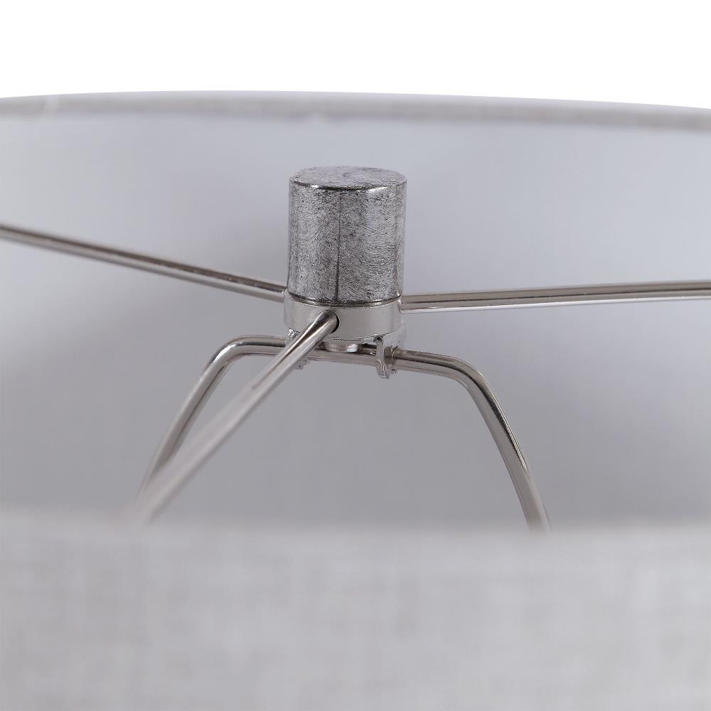 Finished In A Charcoal Glaze With Etched Texture, This Table Lamp Adds A Casual Yet Contemporary Feel To A Space. The Round Ceramic Base Is Complimented By Brushed Nickel Hardware. A Round Hardback Drum Shade In Oatmeal Linen Completes The Piece.
