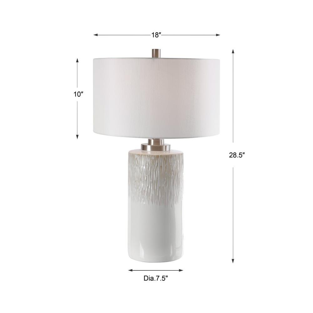 This Lamp Showcases An Aged White Ceramic Base Accented With Charcoal Flecks And Textured Beige Drip Details. Brushed Nickel Hardware Is Paired With This Piece. The Round Hardback Shade Is A White Linen Fabric. Due To The Nature Of Fired Glazes On Ceramic Lamps, Finishes Will Vary Slightly.