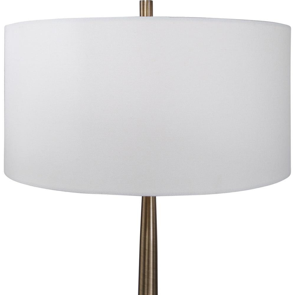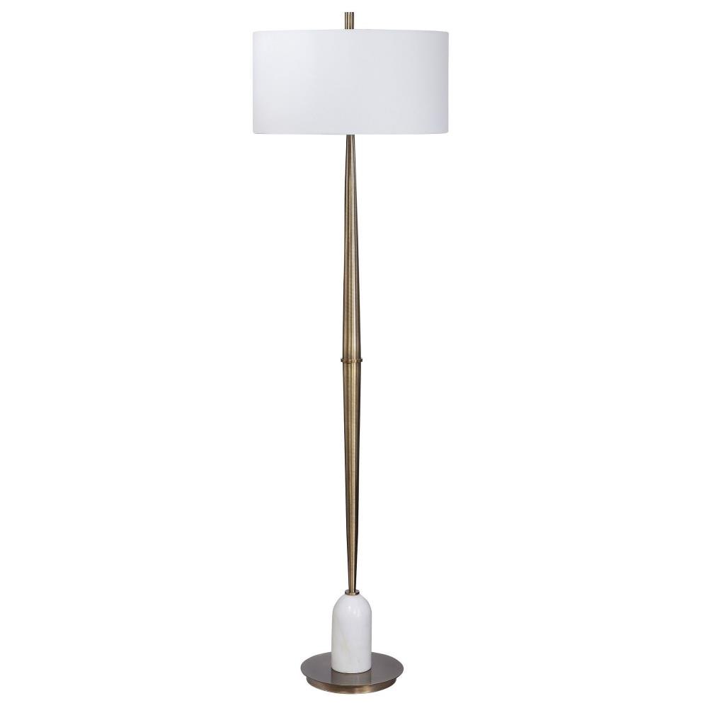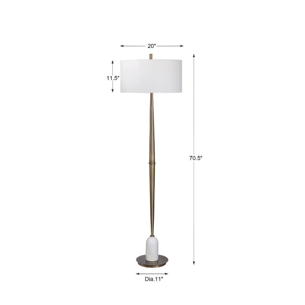 Transitional In Design, This Floor Lamp Has A Tapered Base Finished In A Plated Antique Brass, Accented With A Polished White Marble Detail. The Piece Has A White Linen Hardback Drum Shade.