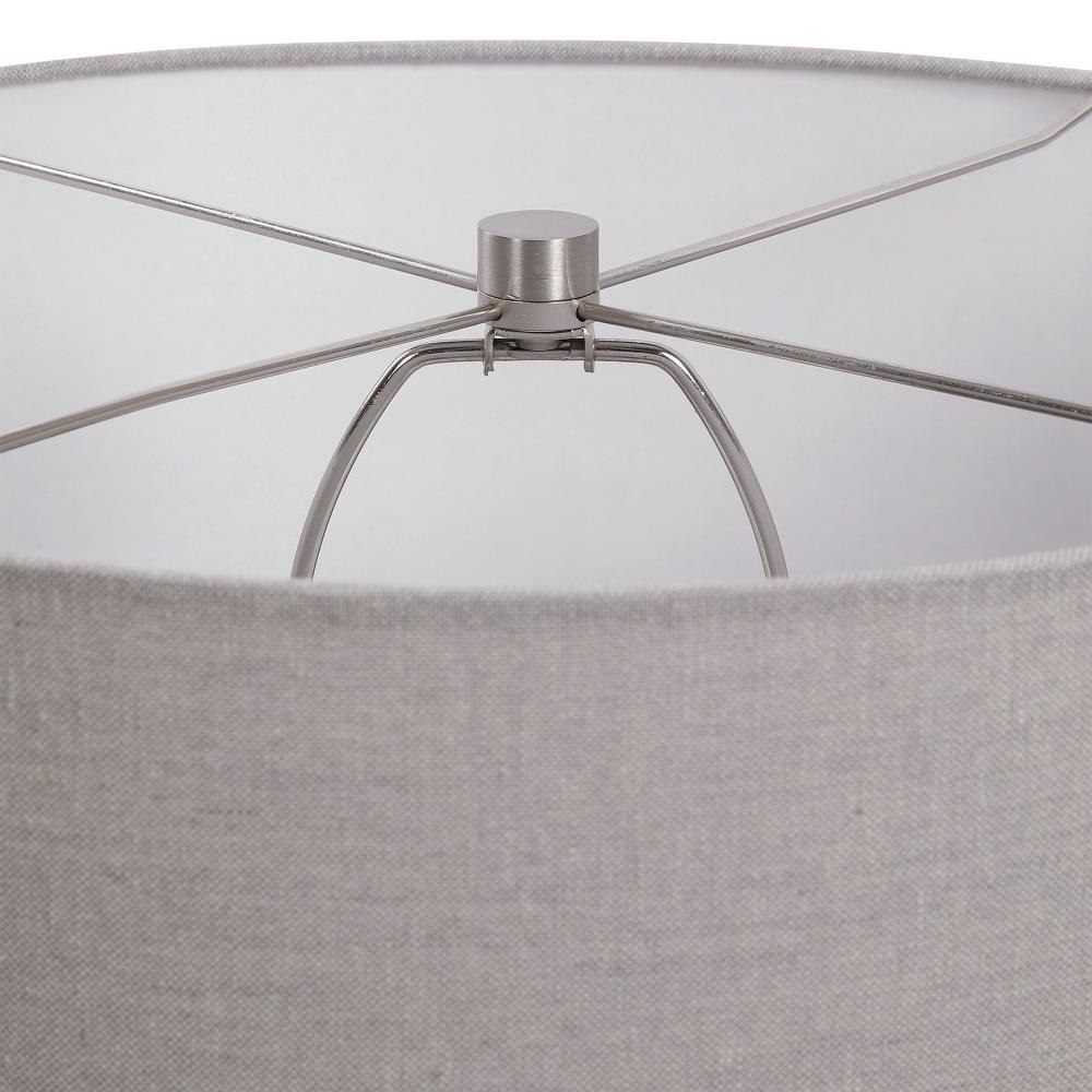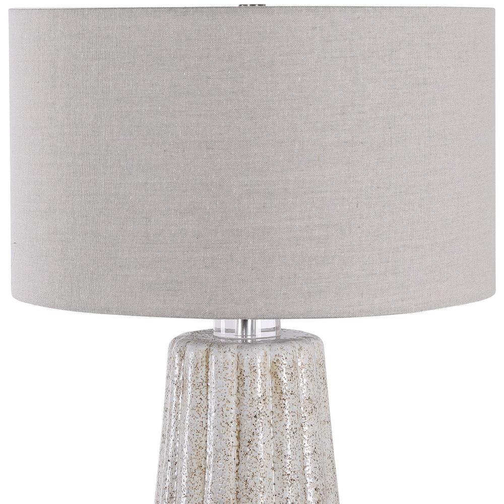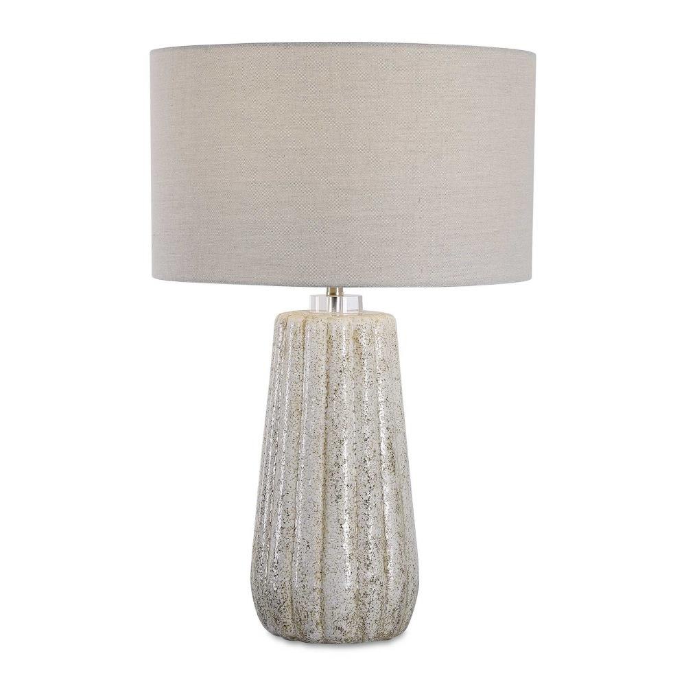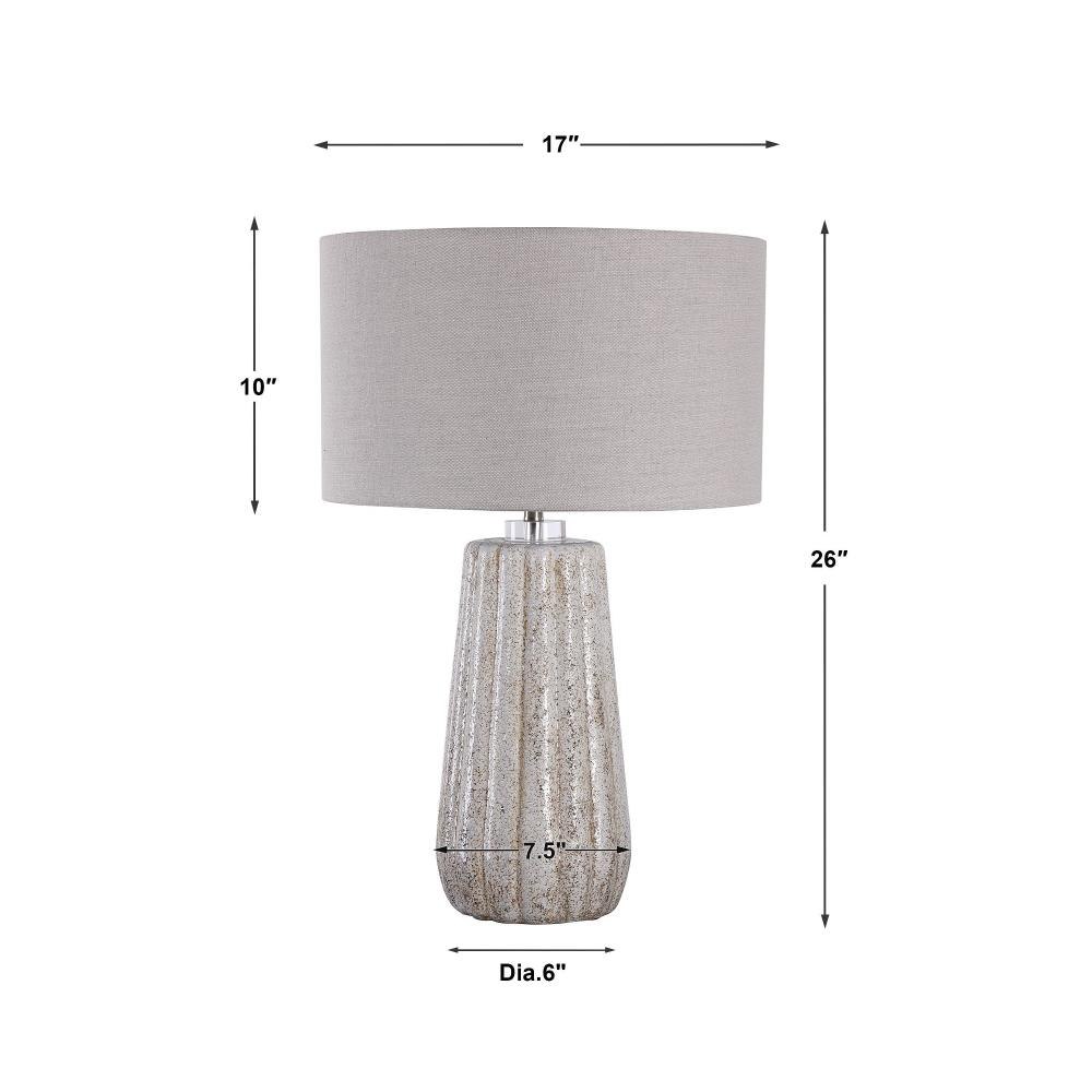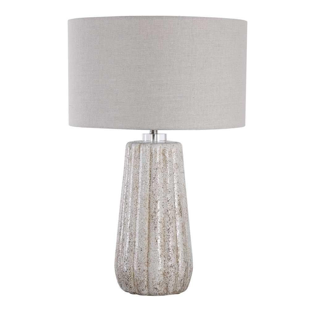 This Ceramic Table Lamp Features A Fluted Design With A Porous Texture Finished In A Stone-ivory And Taupe Glaze, Accented With Brushed Nickel Plated Details And A Thick Crystal Collar. A Light Gray Fabric Drum Shade Completes The Look.