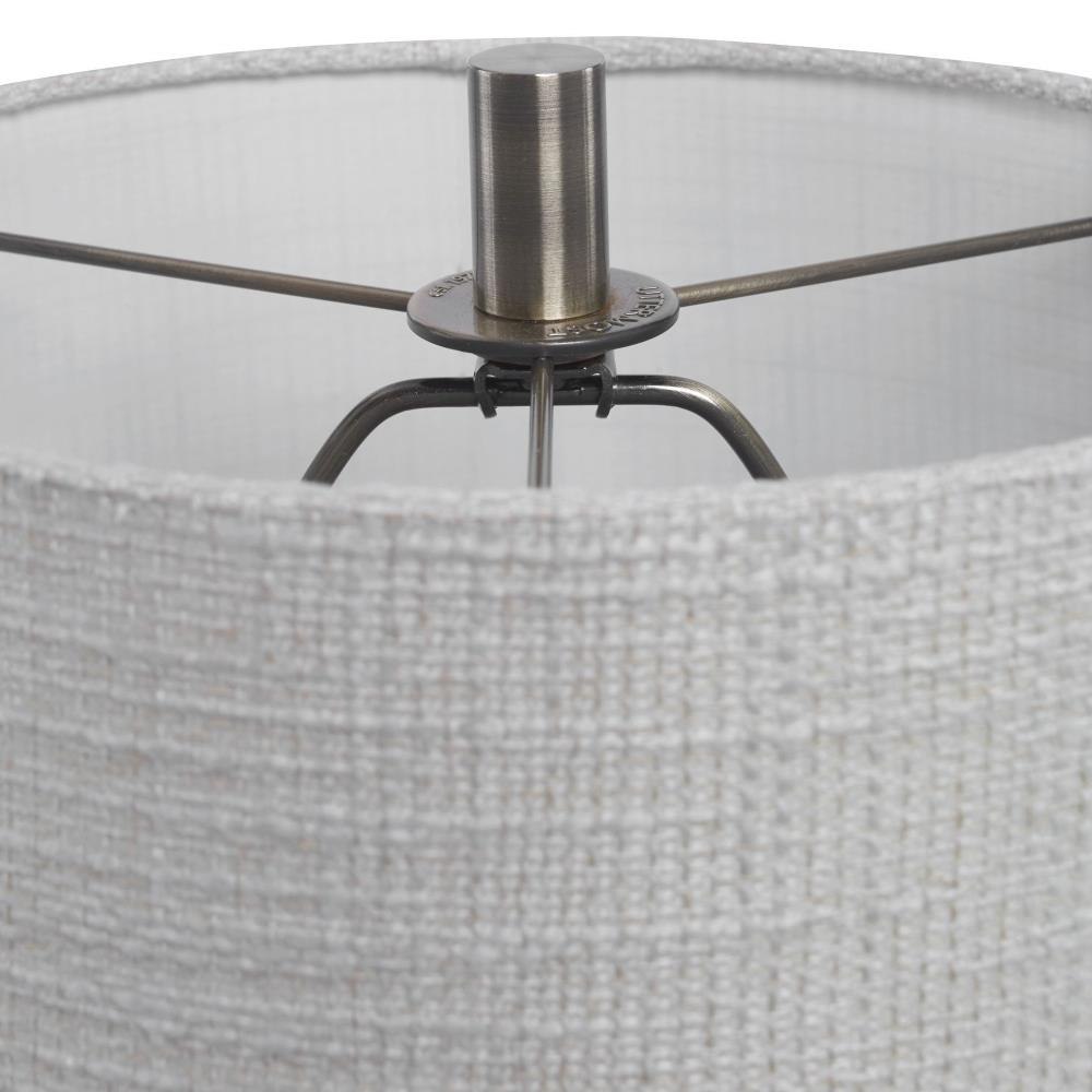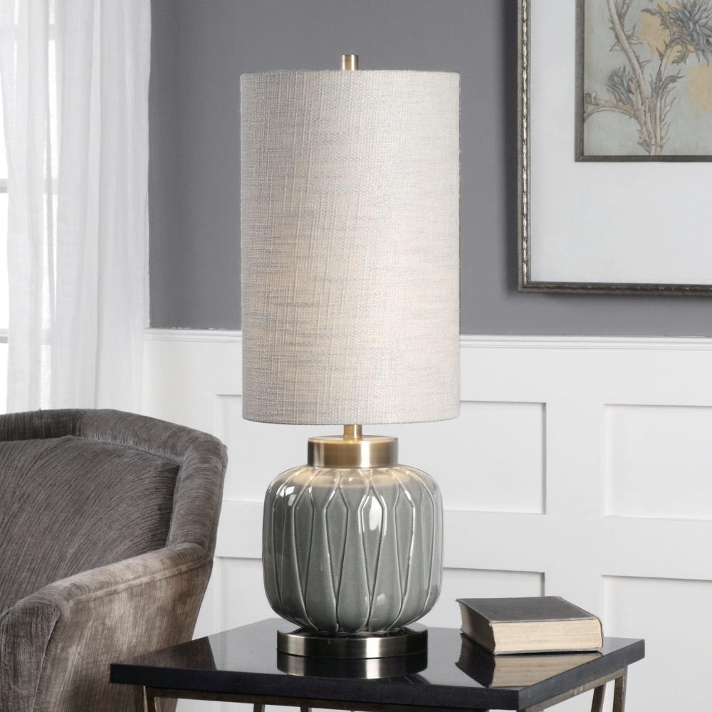 Aged Gray Ceramic, Featuring An Embossed Decorative Design, Accented With Heavily Antiqued Brass Plated Details. The Tall, Round Hardback Shade Is A Light Khaki Linen Fabric With Heavy Slubbing. Due To The Nature Of Fired Glazes On Ceramic Lamps, Finishes Will Vary Slightly.