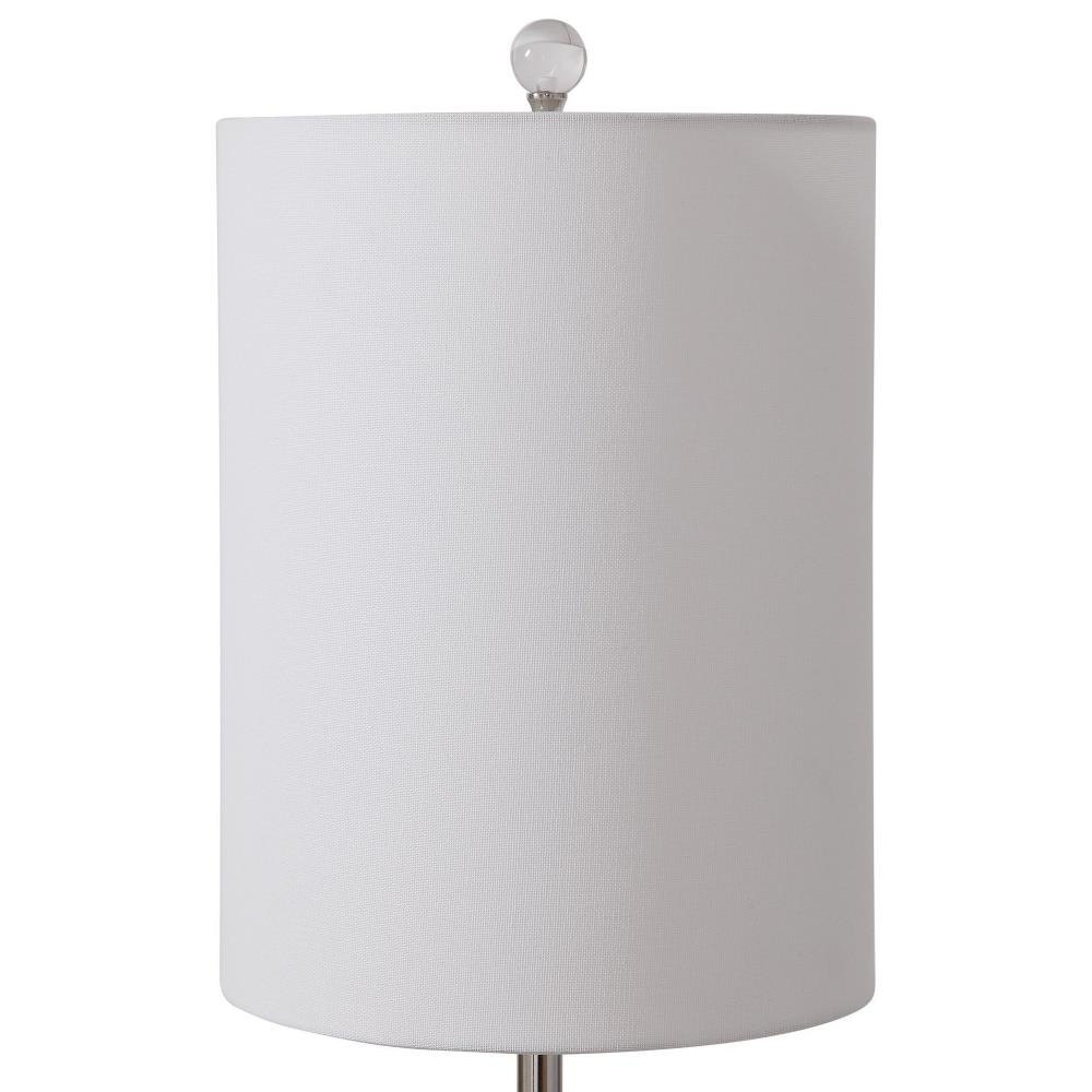 This Buffet Lamp Features A Ceramic Base Finished In A Mottled Blue Glaze With Subtle Rust Distressing. Polished Nickel Plated Details And Crystal Accents Compliment This Design. The Round Hardback Shade Is A White Linen Fabric.