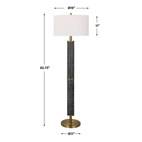 This floor lamp features an organically carved design in a rustic gray-black with solid iron details finished in plated antique brass. The lamp is paired with a hardback drum shade in a white linen fabric.