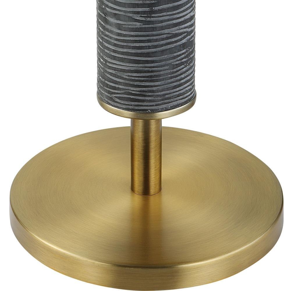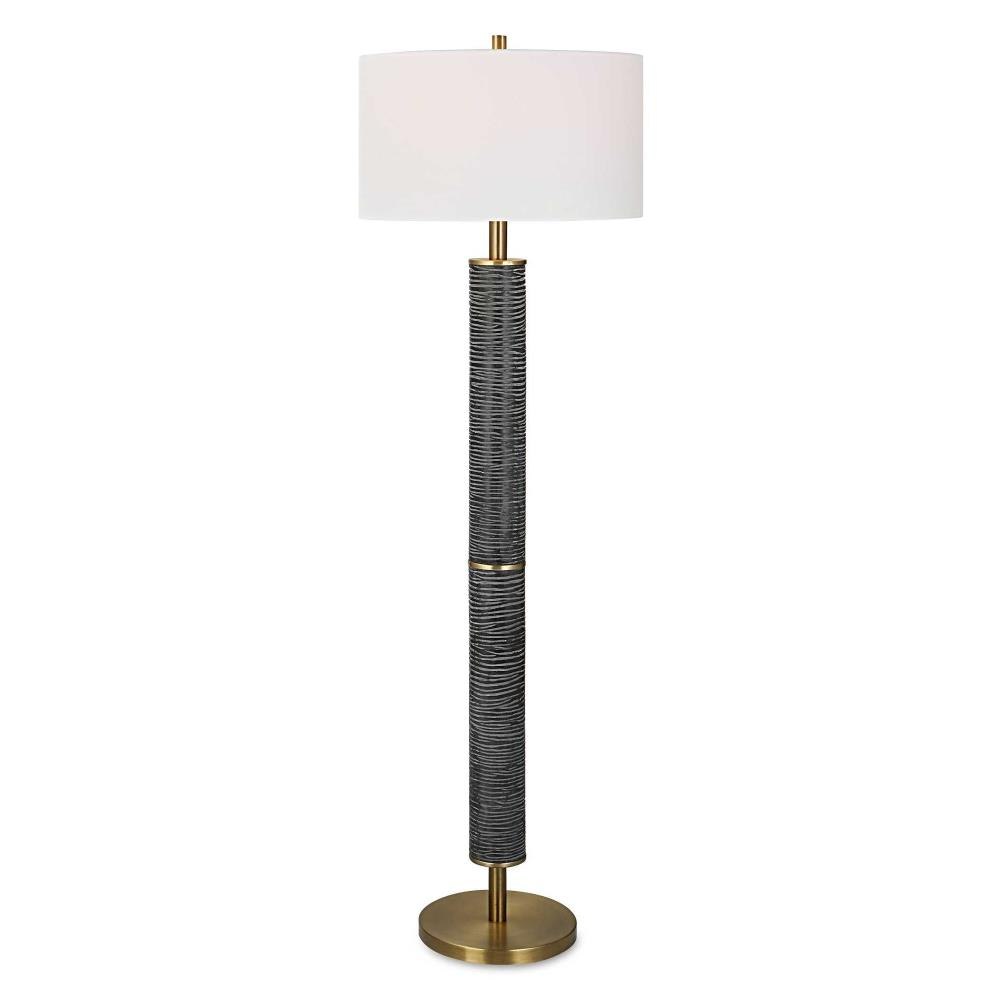 This Floor Lamp Features An Organically Carved Design In A Rustic Gray-black With Solid Iron Details Finished In Plated Antique Brass. The Lamp Is Paired With A Hardback Drum Shade In A White Linen Fabric.