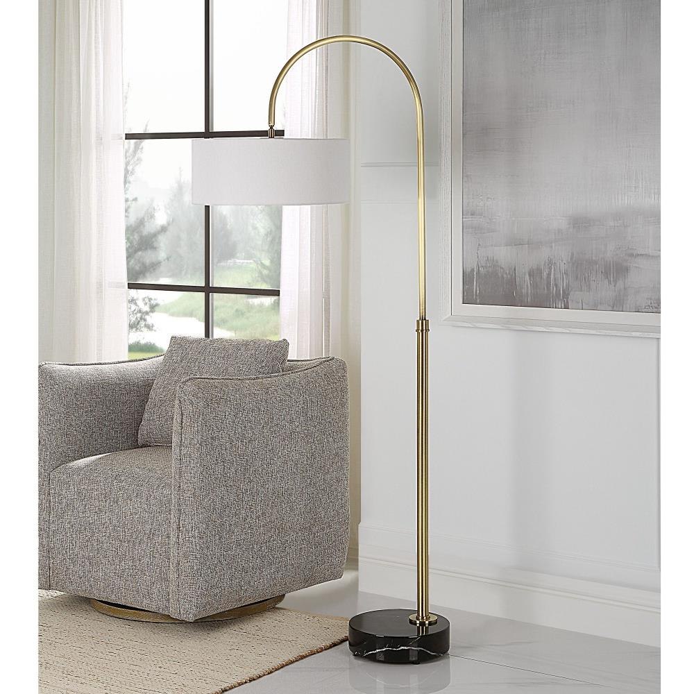 This Classic Arc Floor Lamp Is Crafted From Iron Finished In A Plated Antique Brushed Brass, Accented By A Thick Black Marble Foot With Natural Veining.