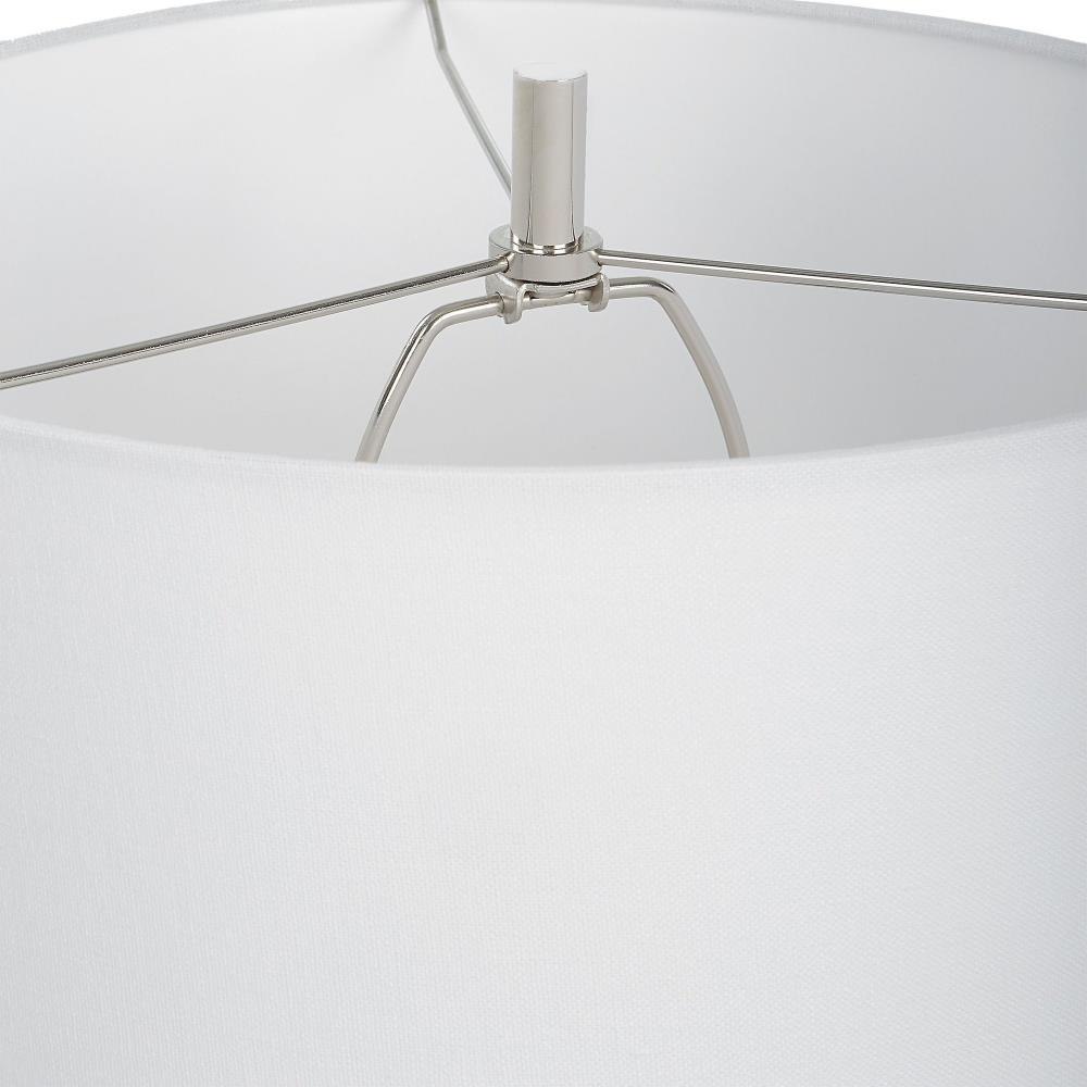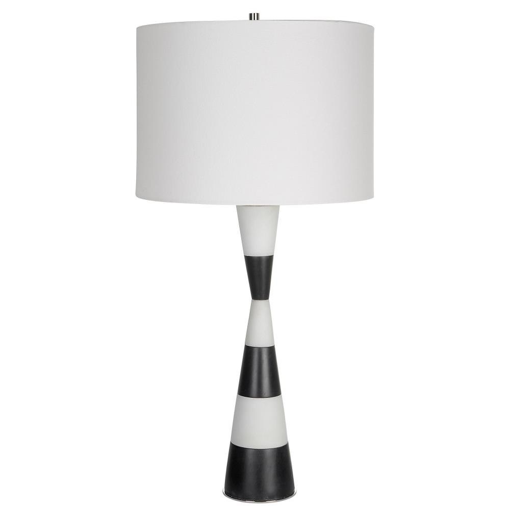 The Bandeau Lamp Is Crafted From A Banded Black And White Man-made Stone That Accentuates Its Hourglass Shape And Accurately Replicates The Look Of Thassos Marble. Iron Details Are Finished In Polished Nickel. Paired With A White Linen Fabric Drum Shade.