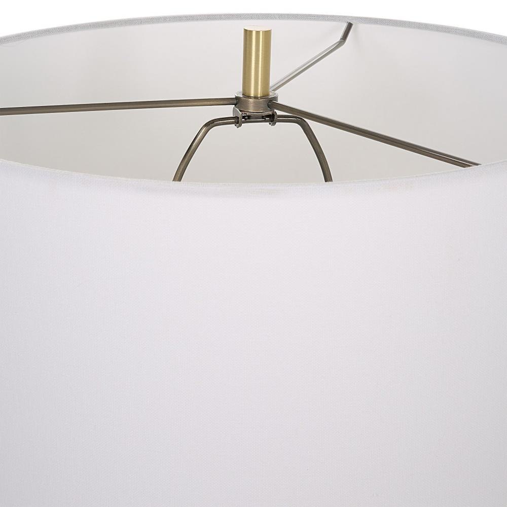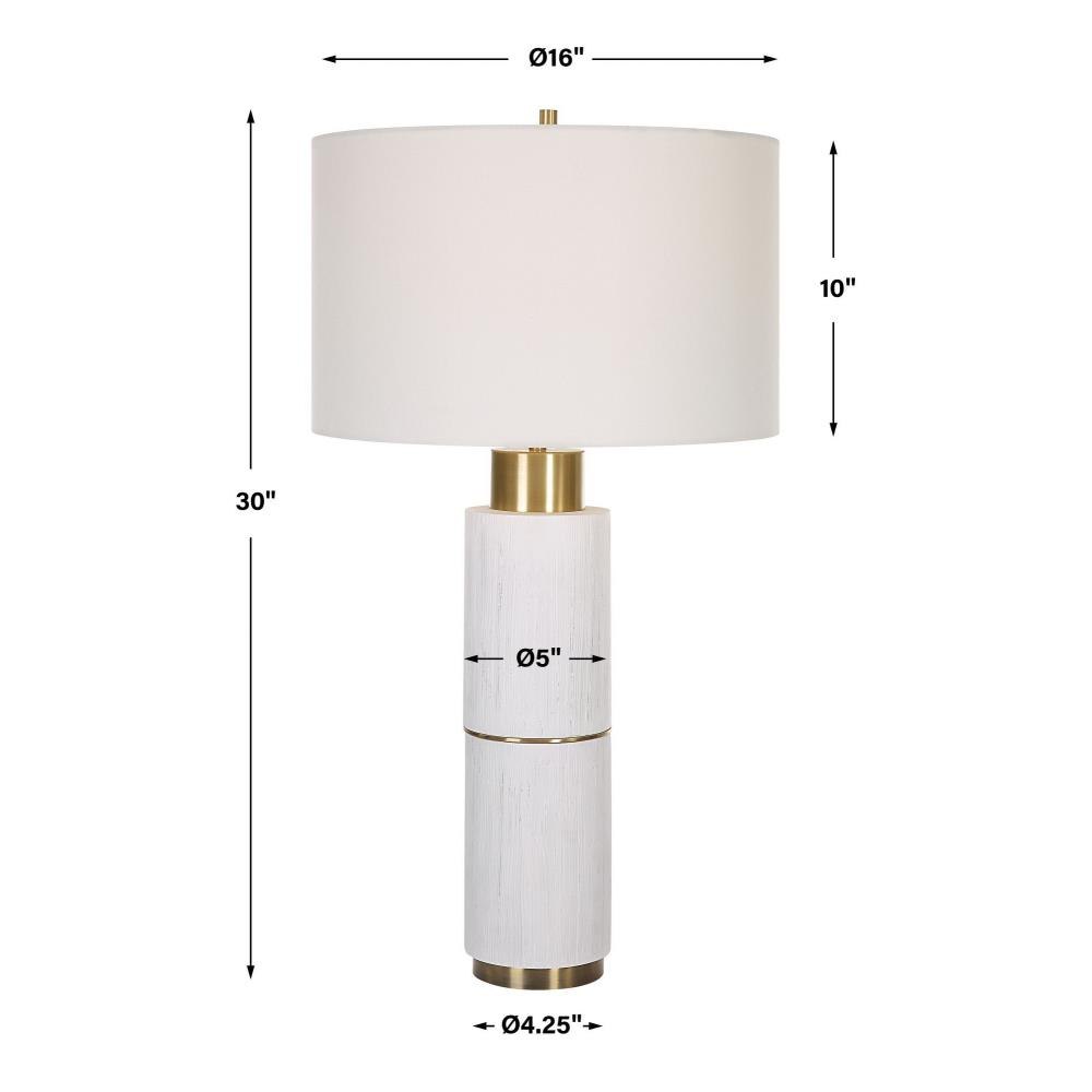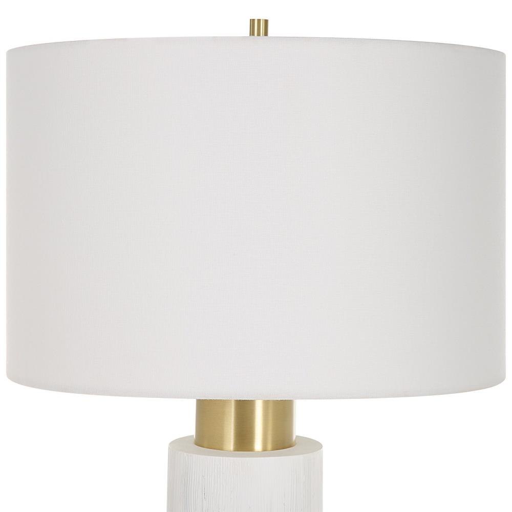 The Ruse Table Lamp Showcases A Whitewashed Wood Look With A Noticeable Textured Finish, Accented By Brushed Brass Plated Iron Details. Paired With A Hardback Drum Shade In A White Linen Fabric.