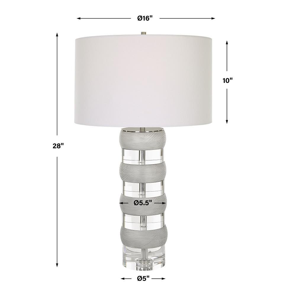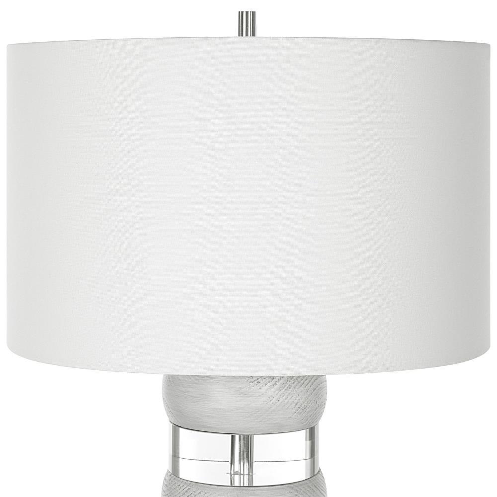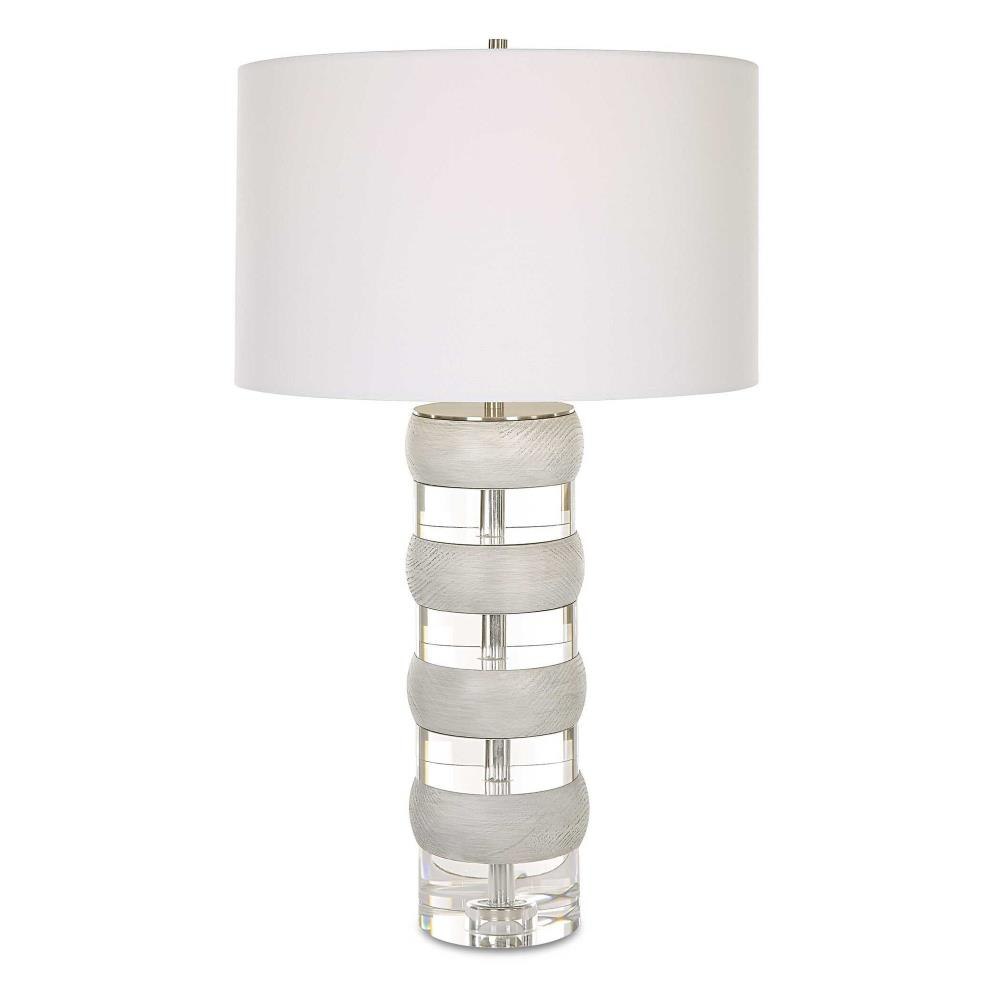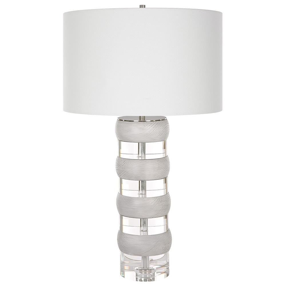 The Band Together Table Lamp Displays A Unique Pairing Of Stacked Thick Crystal And Bleached Wooden Discs, Accented By Brushed Nickel Plated Iron Details. The Lamp Is Topped With A White Fabric Covered Hardback Drum Shade.