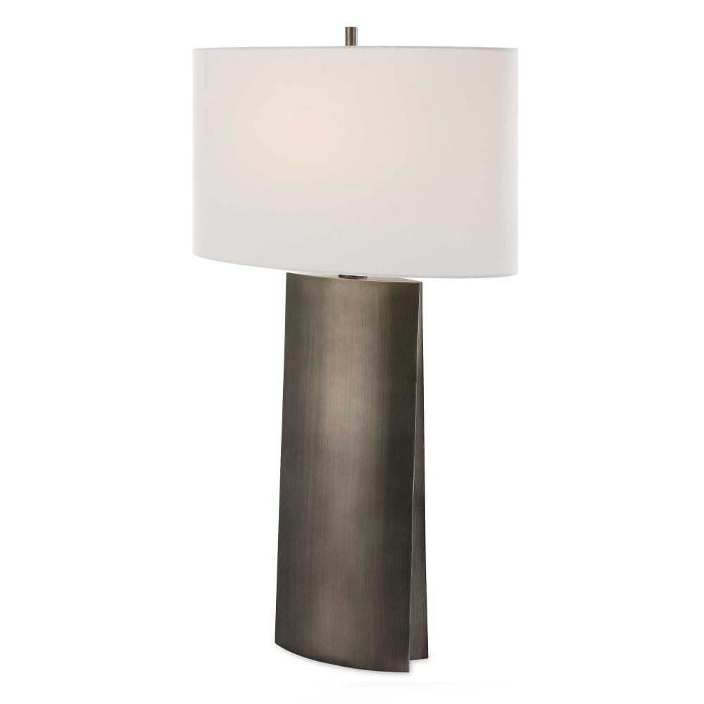 This Contemporary Sculptural Design Showcases A Tapered Silhouette With A Deep Channel Down The Sides, Finished In A Dark Steel Gray. The Oval Drum Shade Is Covered In A White Linen Fabric With Natural Slubbing.