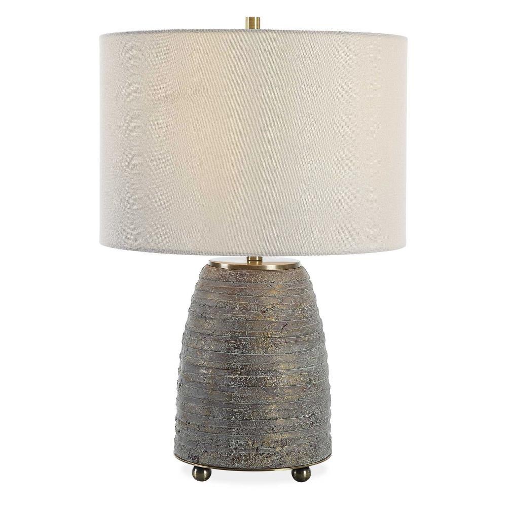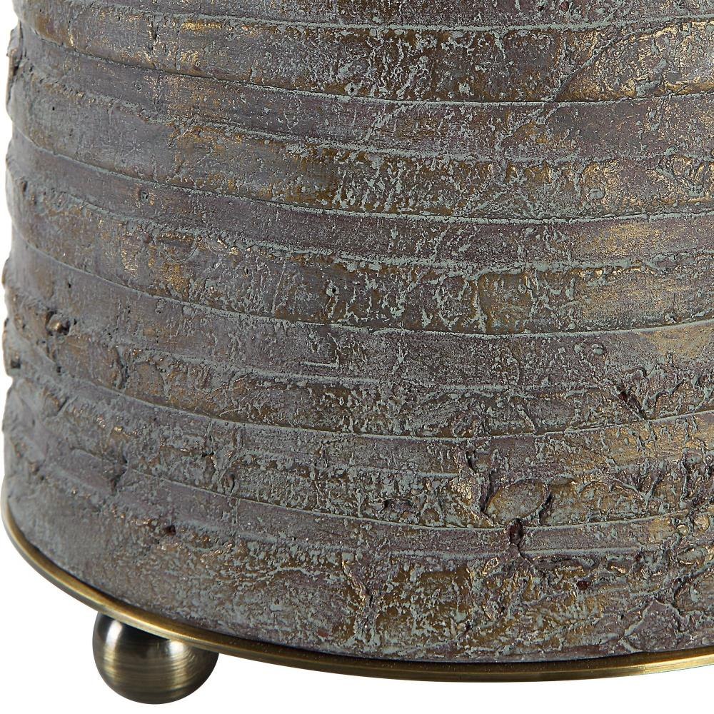Rustic Meets Sophisticated With The Gorda Lamp. Featuring Heavily Textured Bronze Ceramic With A Green Patina Overlay Accented With Plated Brushed Antiqued Brass Details. The Round Drum Hardback Shade Is A Beige Linen Fabric. Due To The Nature Of Fired Glazes On Ceramic Lamps, Finishes Will Vary Slightly.