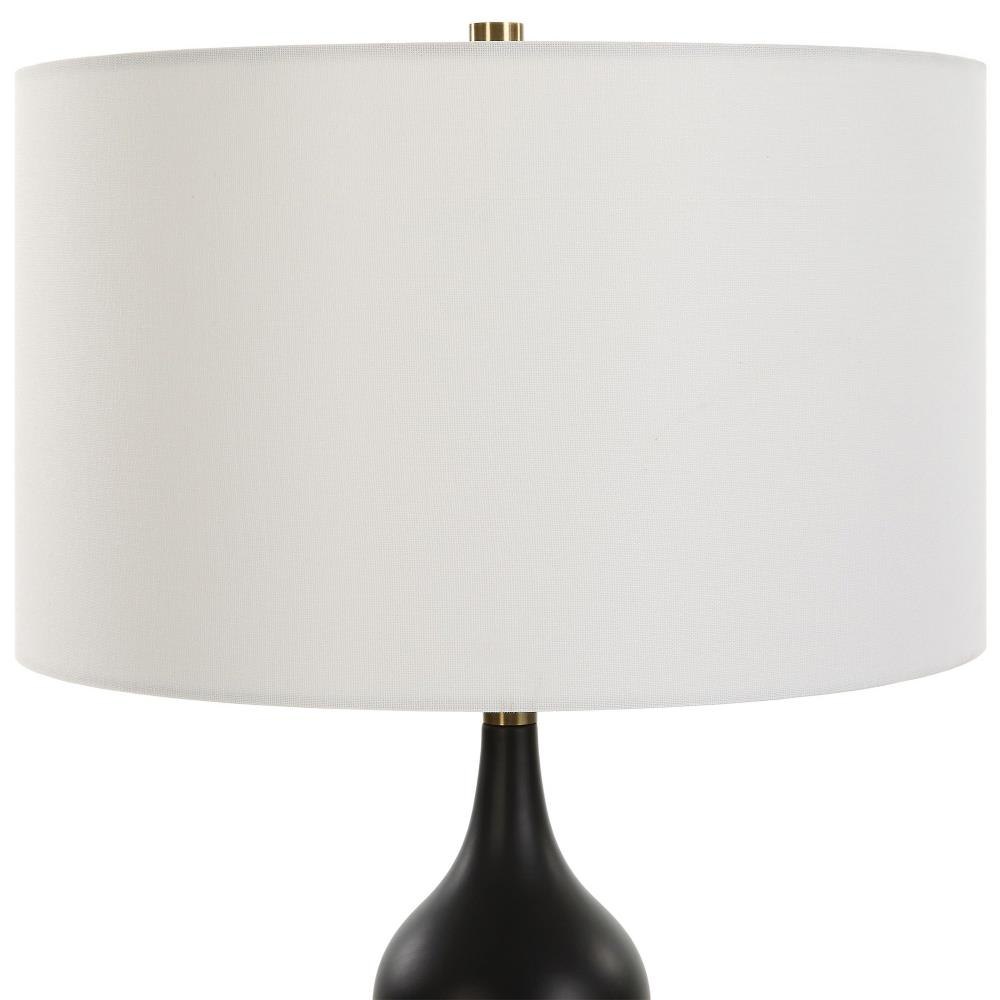 The Caviar Table Lamp Features A Ceramic Base That Boast A Curvaceous Silhouette Finished In A Matte Black Glaze And Displayed On A Crystal Foot And Accented With Antique Brass Hardware. A White Linen Round Hardback Shade Completes The Piece.