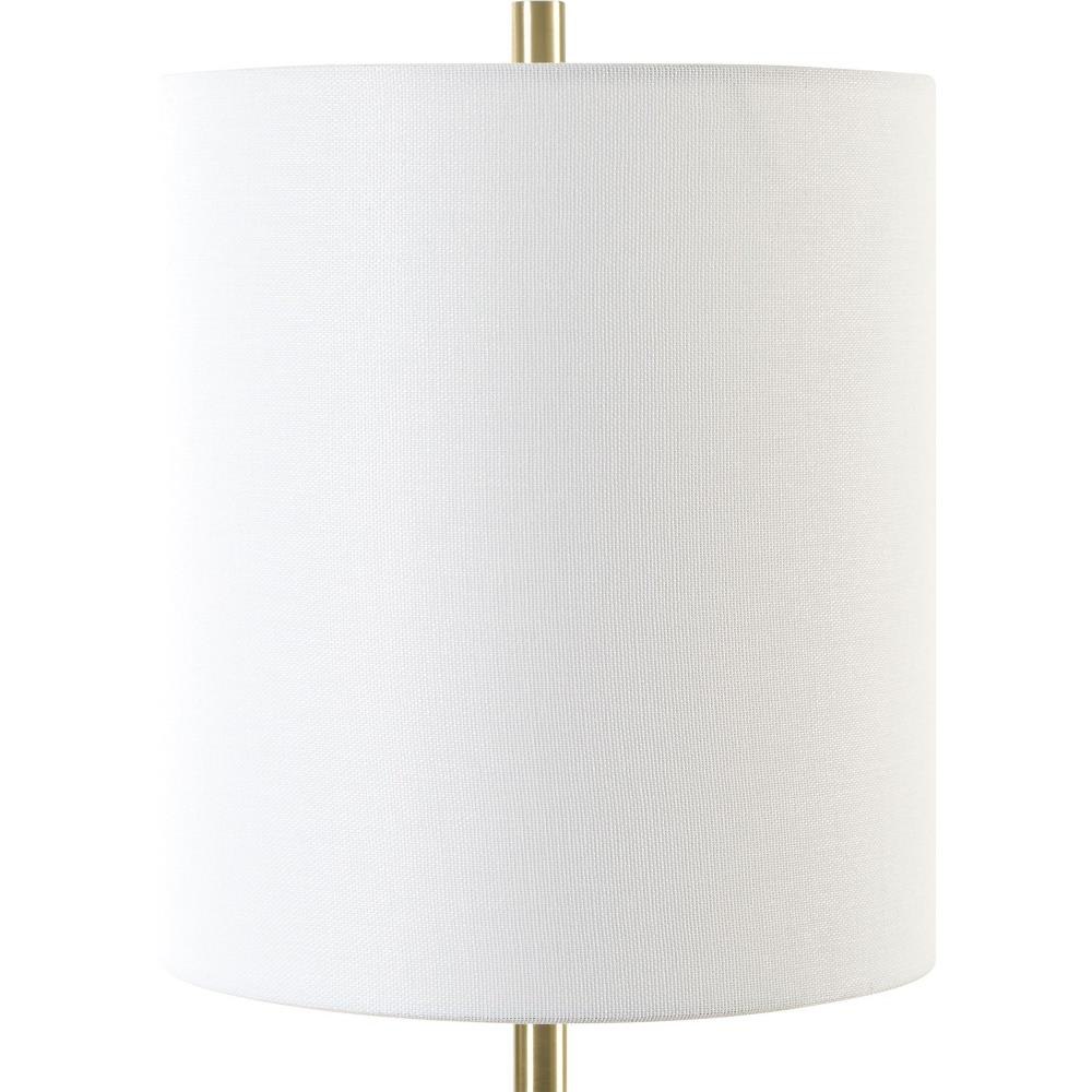 The Enigma Buffet Lamp Showcases A Smoky Teal Blue Art Glass Body Paired With Brass Plated Details And A Clear French Cord. The Tall Drum Hardback Shade Is Covered In A Crisp White Linen Fabric.