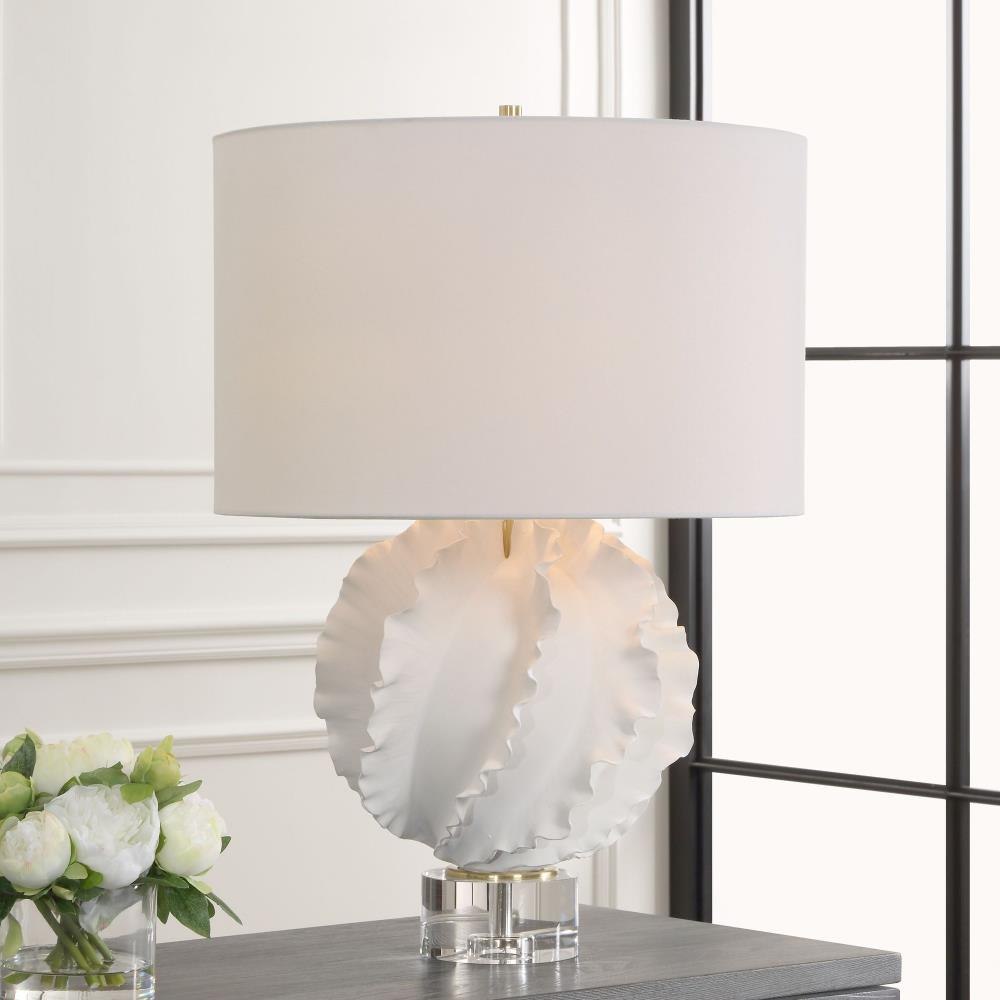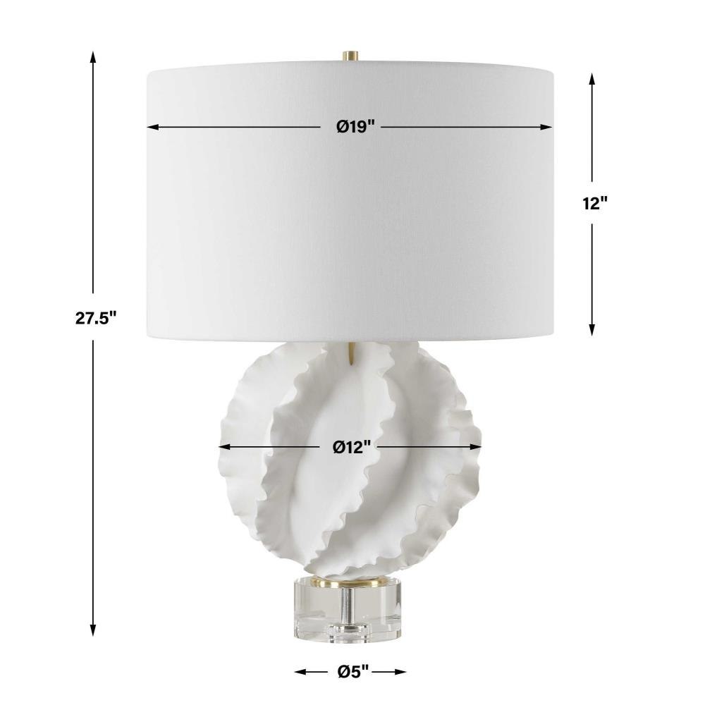 This Ceramic Table Lamp Is Finished In A Satin White Glaze Featuring Gracefully Flowing Deep Ridges, Accented With Brass Plated Details And A Thick Crystal Foot. The Round Drum Shade Is Covered In A Crisp White Linen Fabric.