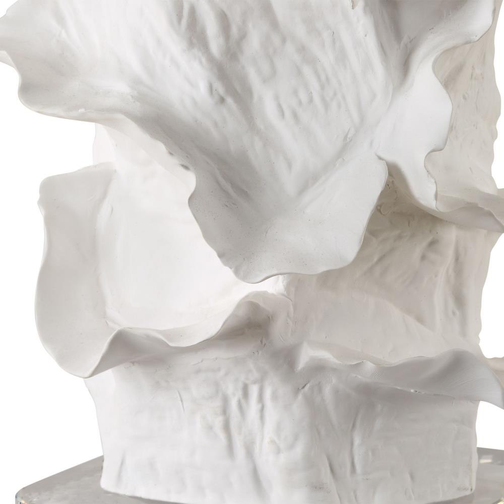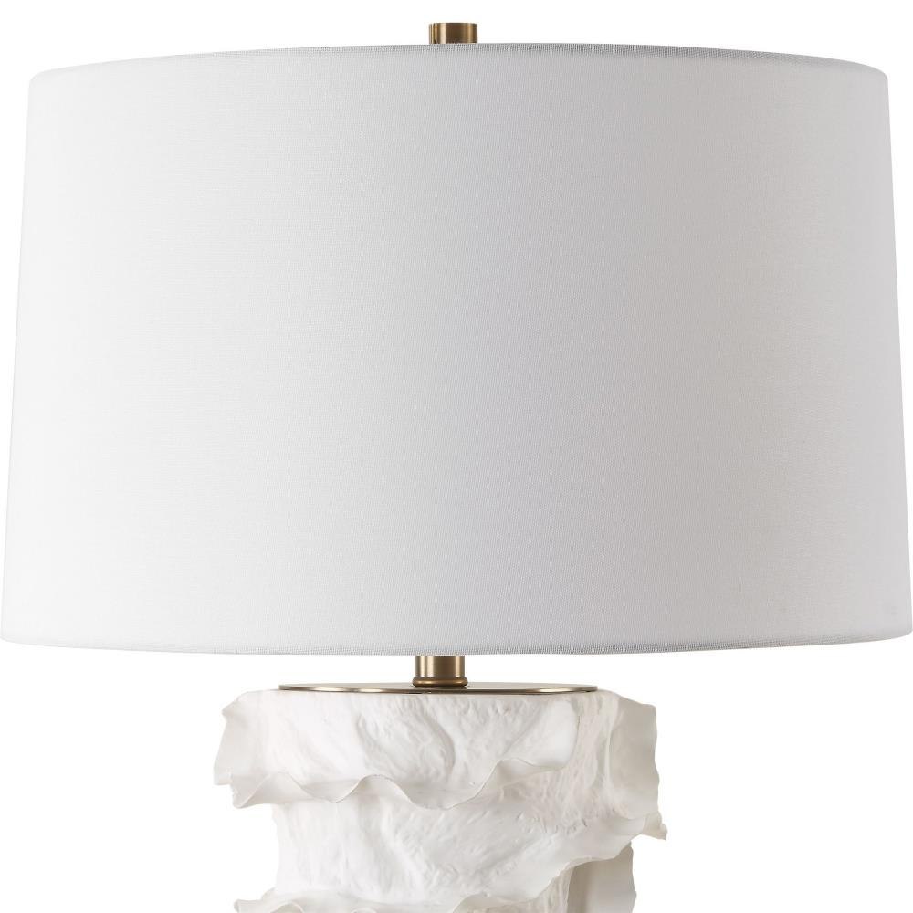 This Ceramic Table Lamp Is Finished In A Satin White Glaze Featuring Gracefully Flowing Deep Ridges With An Organic Nature, Accented With Brass Plated Details And A Thick Crystal Foot. The Slightly Tapered Round Hardback Shade Is Covered In A Crisp White Linen Fabric.