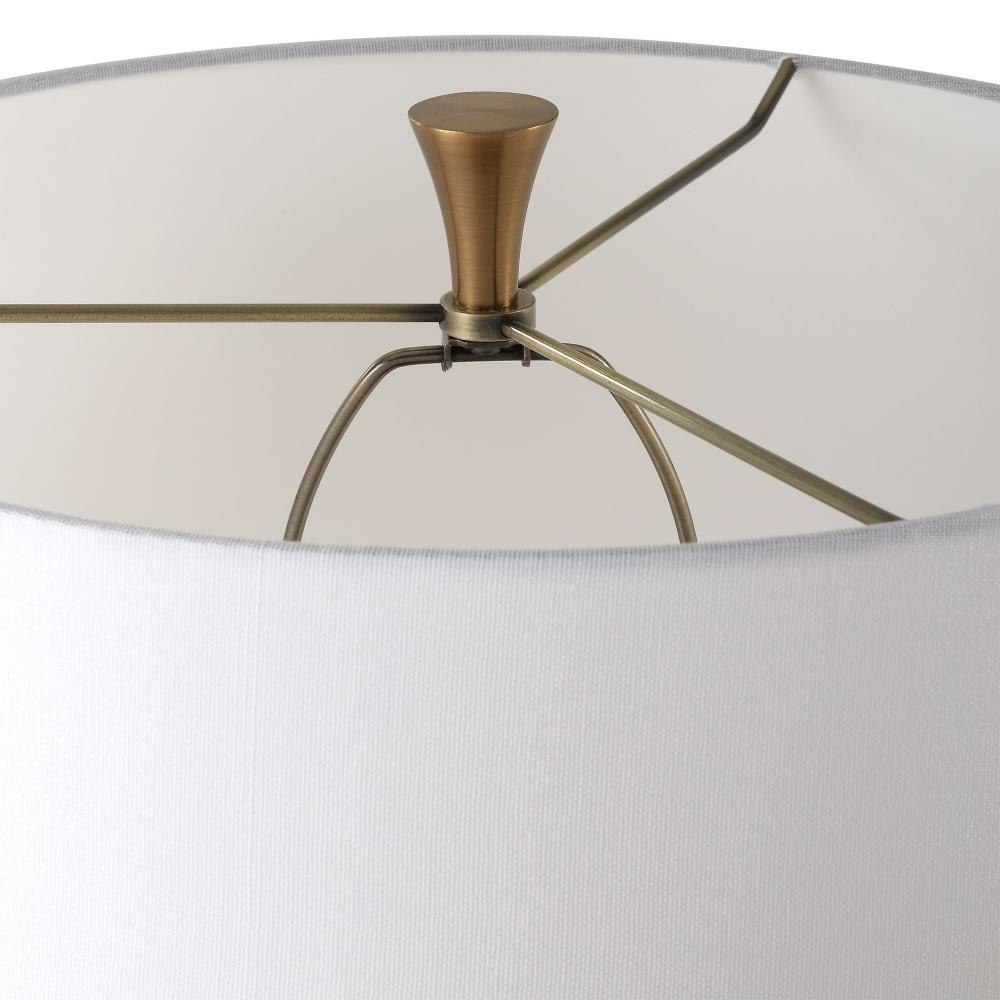 This Floor Lamp Adds An Air Of Elegance And Sophistication To Any Space. The Base Of The Lamp Is Crafted From Ivory Man-made Stone That Accurately Replicates The Look Of Thassos Marble And Is Accented By Plated Antique Brass Details, Displayed On A Crystal Foot. The Tapered Round Hardback Shade Is Covered In A White Linen Fabric.