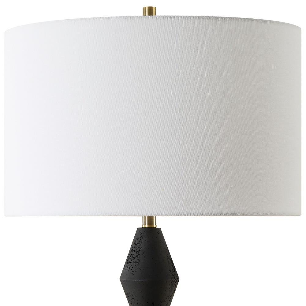 This Table Lamp Is Crafted From Cast Black Man-made Stone For A Bold Yet Refined Aesthetic. Its Distinctive Pitted Surface Adds Character And Texture, Complemented By Antique Brass Plated Details For A Touch Of Vintage Allure. The Round Hardback Drum Shade Is A Crisp White Linen Fabric.