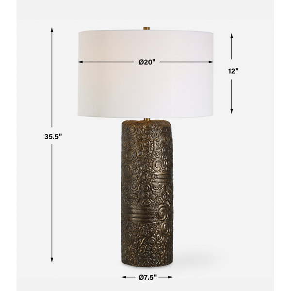 Transform your space with the charm of nostalgia embodied in our ceramic table lamp. Its whimsical carvings and asymmetrical column shape evoke the essence of a cherished found object. Finished in a distressed aged bronze and accented with plated brass details, it exudes timeless elegance with a touch of vintage allure. The round hardback drum shade is a crisp white linen fabric.