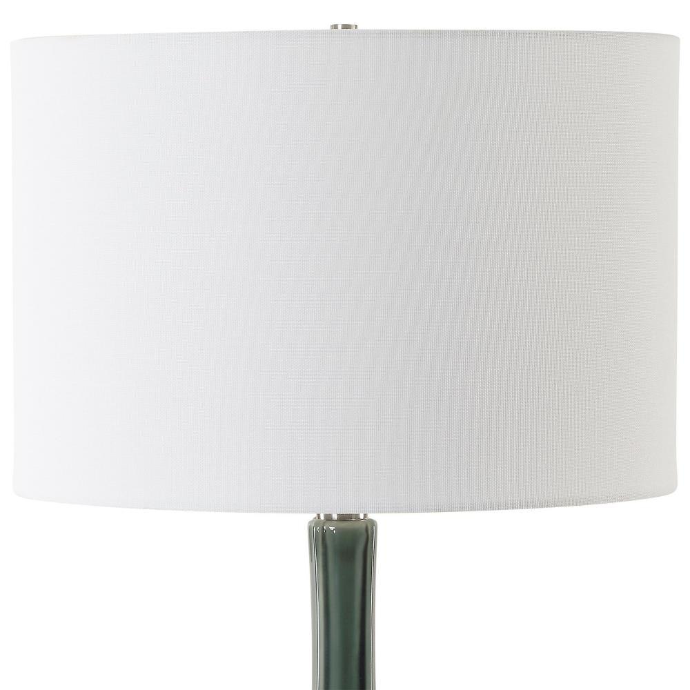 This Ceramic Fluted Base Is Adorned In A Hunter Green Crackled Glaze. This Sophisticated Table Lamp Is Further Enhanced By A Thick Crystal Foot And Plated Brushed Nickel Hardware, Bringing A Touch Of Luxury And Refined Taste To Any Room. The Round Drum Hardback Shade Is Made In A Casual White Linen Fabric.