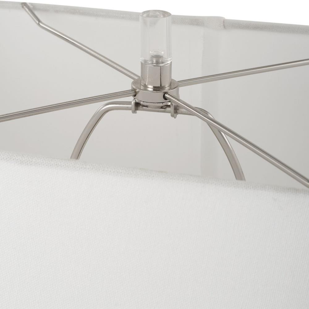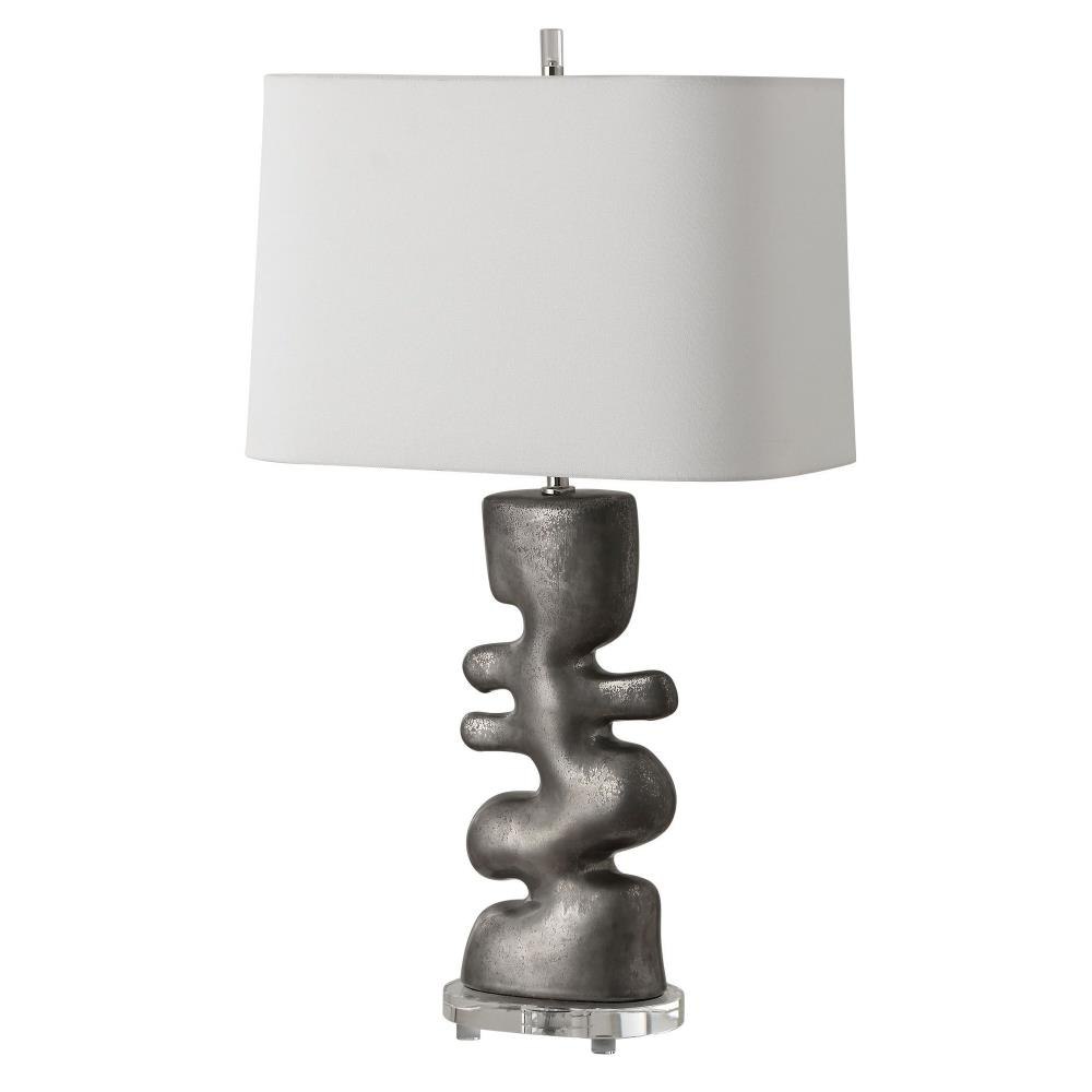 This Lamp Is The Perfect Harmony Of Art And Function. Featuring A Free Flowing, Carefree Designed Base In A Tarnished Nickel Glaze And Accented By A Thick Clear Crystal Foot. The Rectangle Round Cornered Hardback Shade Is A Crisp White Linen Fabric.