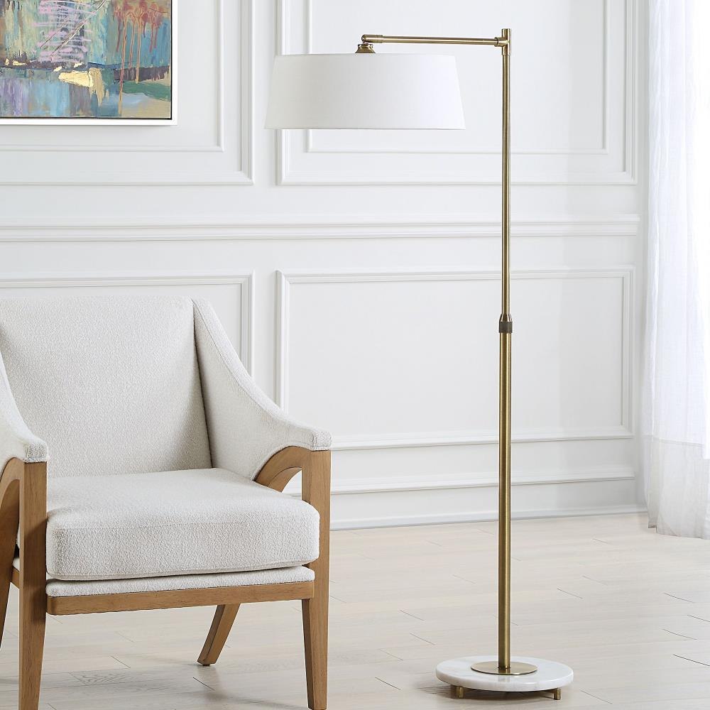 This Refined Floor Lamp Is Crafted From Iron Finished In A Plated Antique Brushed Brass, Attached To A White Marble Foot. The Branch Out Floor Lamp Features A Telescoping Neck That Allows It To Go From A 48" Tall Reading Lamp To A 67" Tall Floor Lamp. The Shallow Slightly Tapered Hardback Shade Is A White Linen Fabric, Attached To A Pivoting Stem.