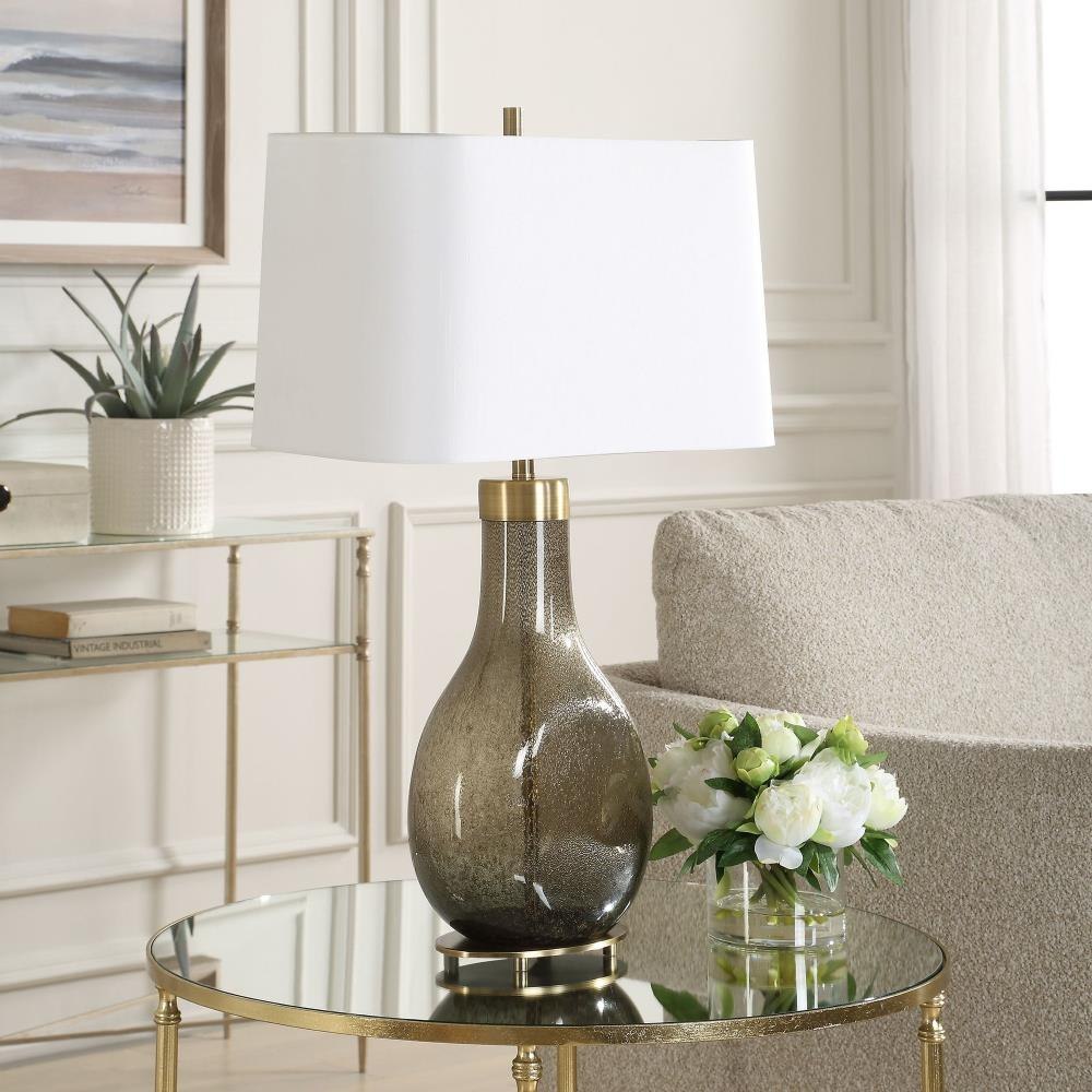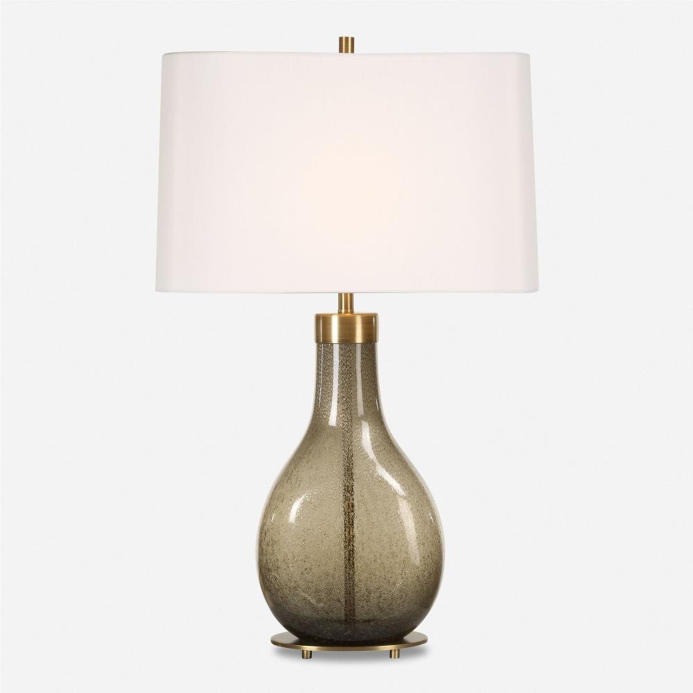 The Shyla Table Lamp Showcases A Dark Moss, Heavily Seeded Teardrop Glass Base Complemented By Plated Brushed Brass Accents. The Slightly Tapered Oval Hardback Shade Is Covered In A Timeless White Linen Fabric.