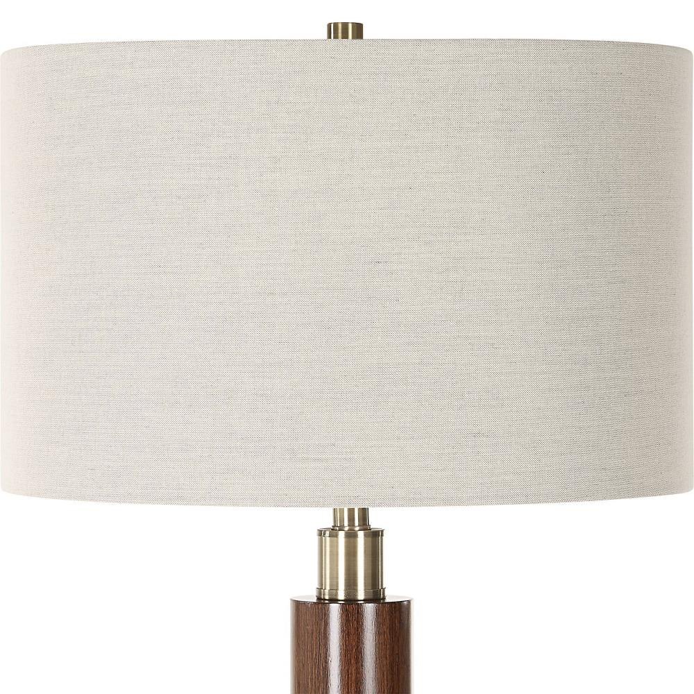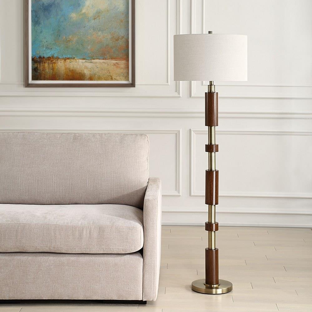 The Stacked Floor Lamp Features A Striking Design With Alternating Wooden Cylinders And Brass Plated Details That Exude A Modern Feel With Mid-Century Elements. The Round Hardback Drum Shade Is A Crisp White Linen Fabric.