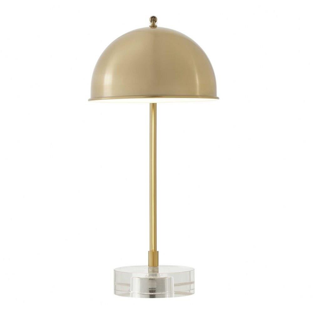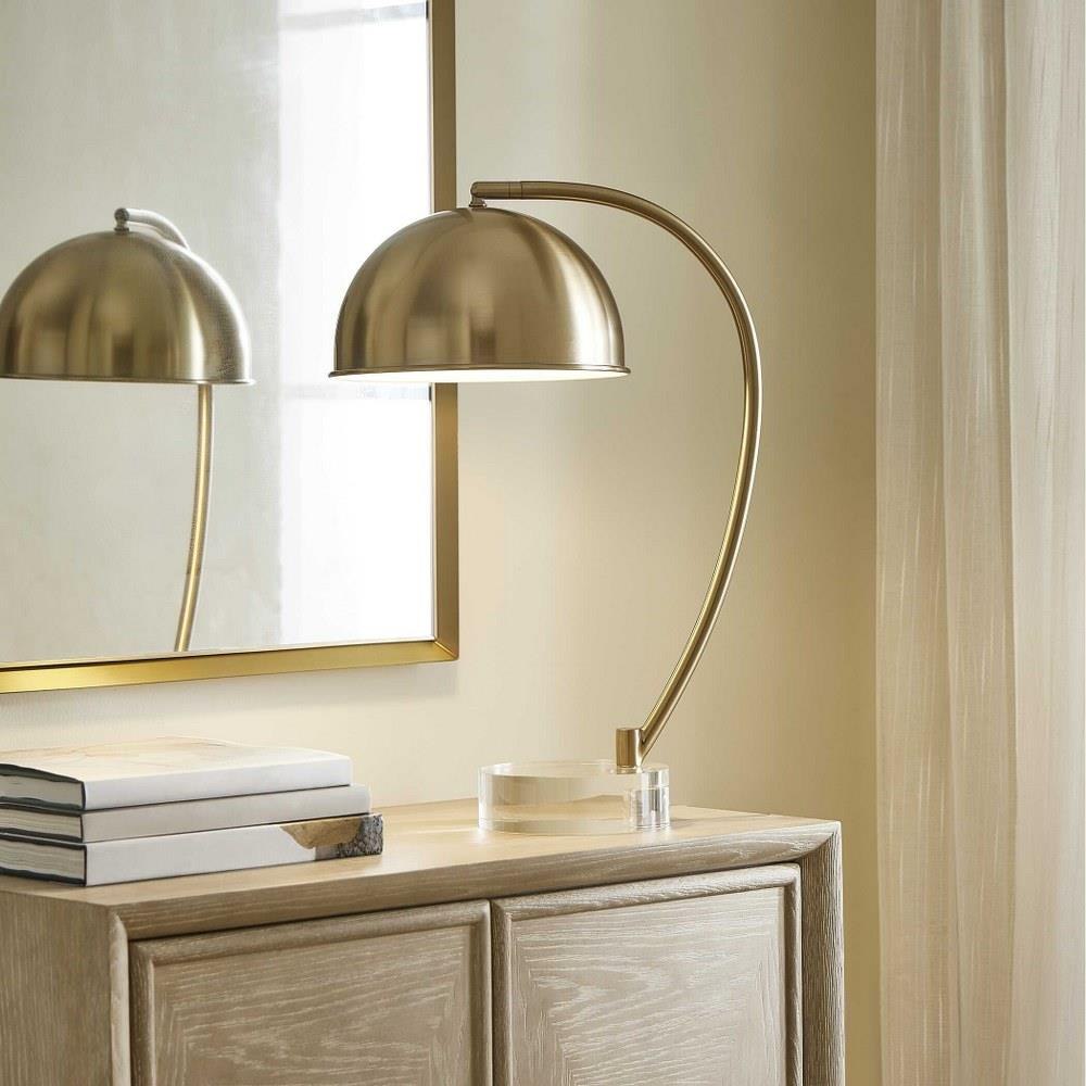 This Desk Lamp Features A Sharply Curved Iron Base Finished In A Plated Antique Brass, Anchored On A Thick Crystal Foot. The Dome-shaped Metal Shade Is Perfectly Positioned To Enhance The Details Of The Lamp's Design And Does Allow For Some Pivot To Angle The Shade Upwards.
