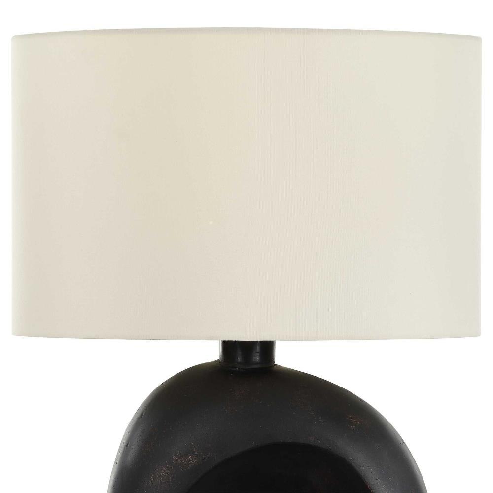 This Indoor/outdoor Lamp Features A Unique, Concrete Sculpted Base With A Distinctive Hollow Center In A Rich, Dark Bronze Finish. The Round Hardback Shade Is Covered In A Warm White, Weather Resistant Linen Fabric.
