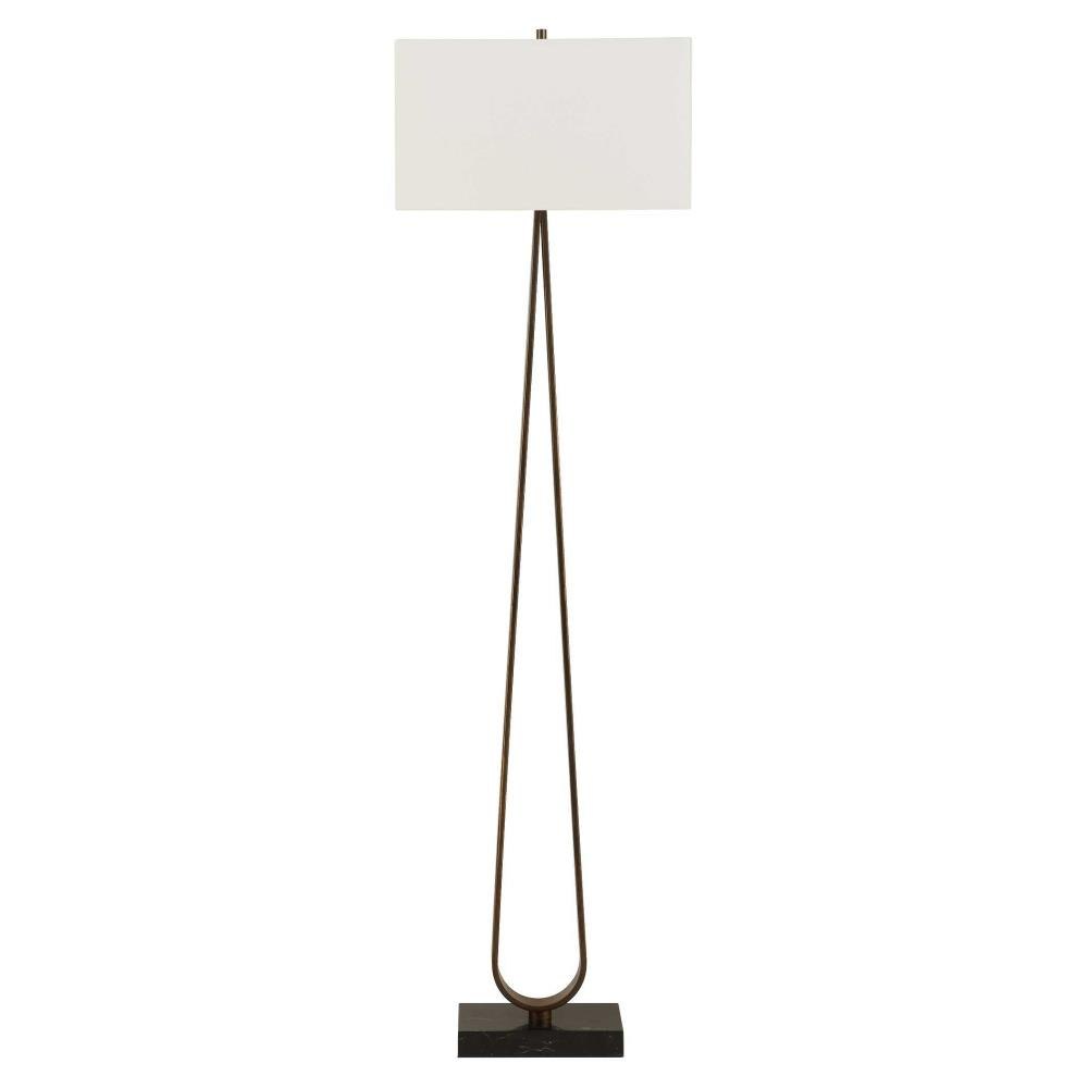 This Floor Lamp Embodies Minimalist Design With Its Slim, Yet Striking Silhouette In Dark Bronze Iron, Complemented By A Black Marble Foot With Subtle White Veining. The Lamp Is Paired With A Rectangular Hardback Shade In A White Linen Fabric.
