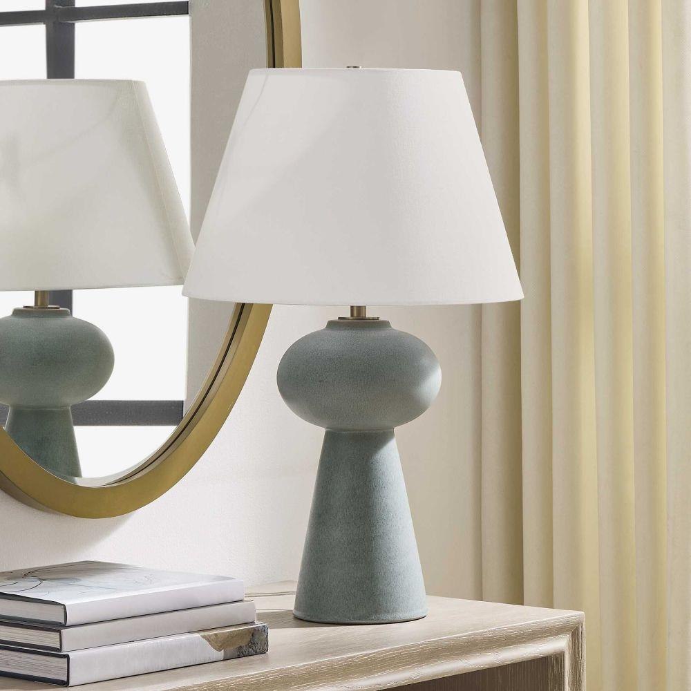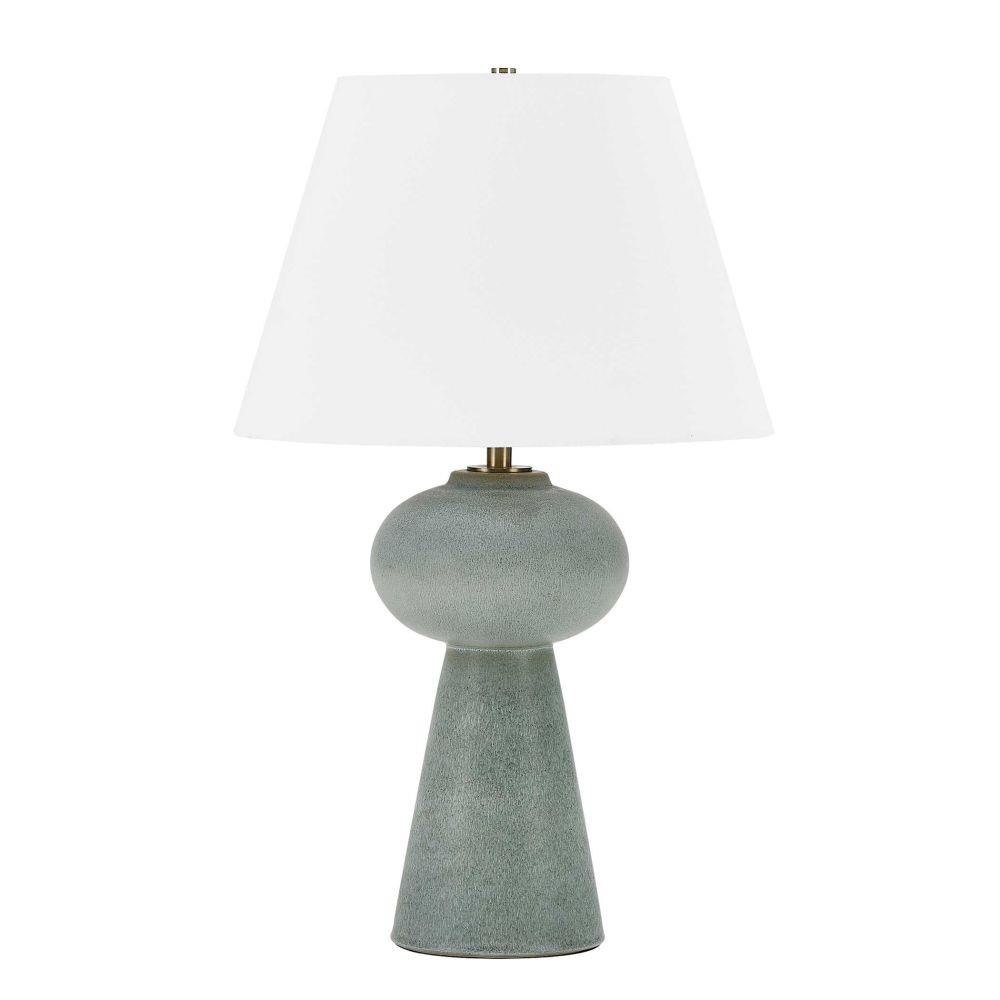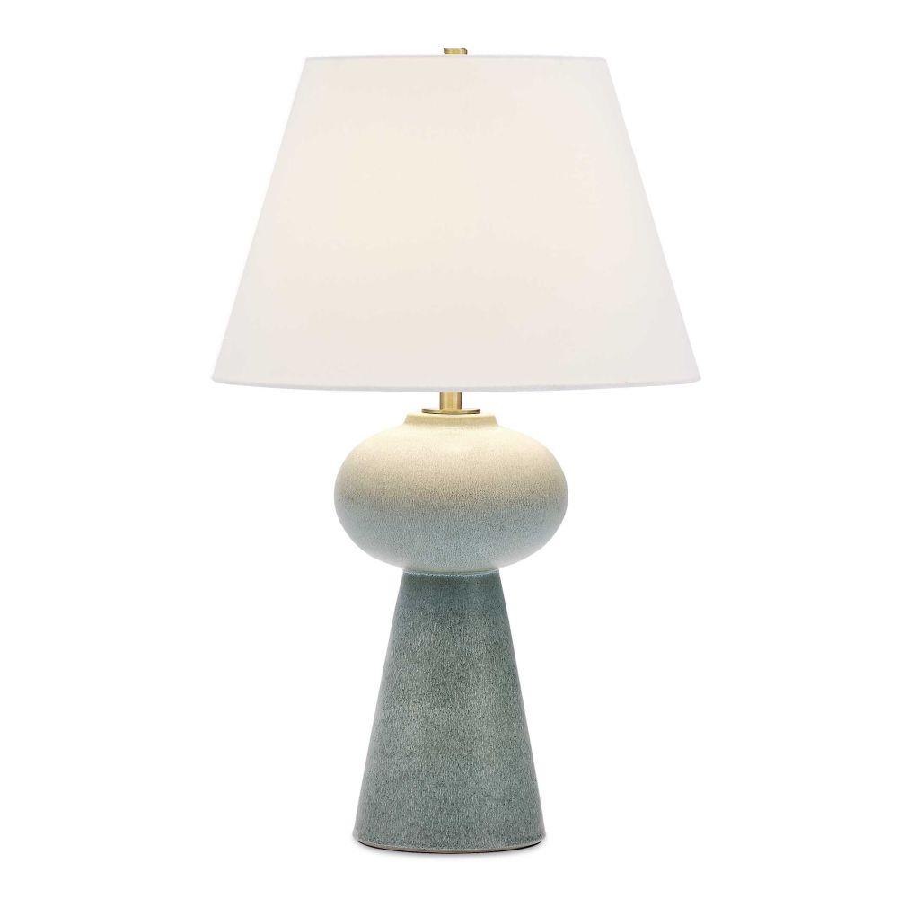 Crafted From Ceramic, This Table Lamp Is Finished In A Sophisticated Light Dusty Blue Glaze, Sporting A Delicate Speckled Texture, Complemented By Antique Brass Plated Accents. The Tapered Shade Is Covered In A Crisp White Linen Fabric. Due To The Nature Of Fired Glazes On Ceramic Lamps, Finishes Will Vary Slightly.