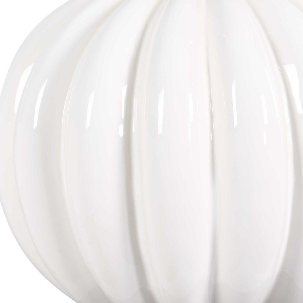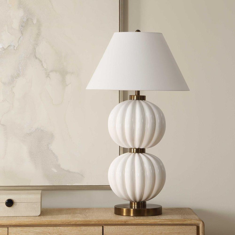 The Irena Table Lamp Features Stacked Ribbed Spheres Finished In A Glossy White Glaze, Accented With Heavily Antiqued Brass Plated Details. The Tapered Round Hardback Shade Is Covered In A Crisp White Linen.