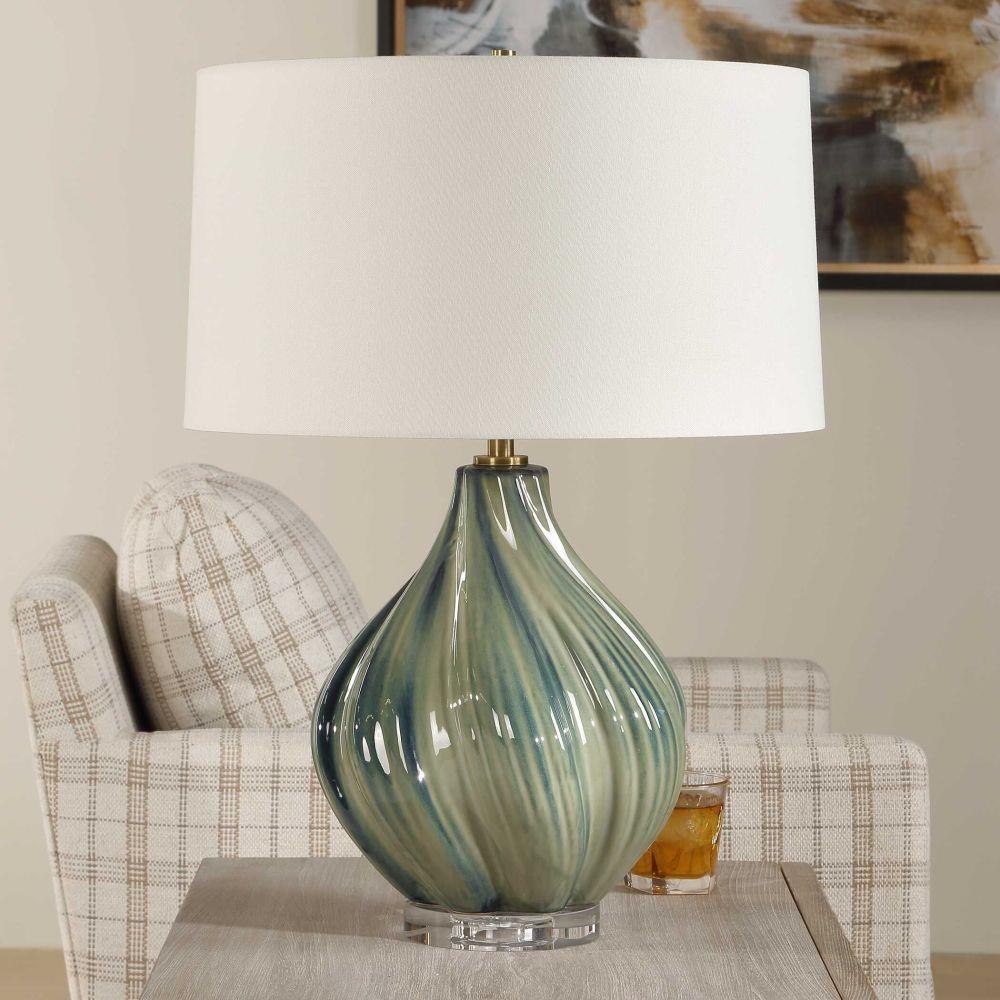 Graced With A Subtly Swirled Ceramic Base, This Elegant Table Lamp Showcases A Harmonious Blend Of Muted Greens And Blue Tones. Its Sophisticated Design Is Further Elevated By A Crystal Foot And Antique Brass Plated Accents. The Slightly Tapered Round Hardback Shade Is Covered In A Crisp White Linen Fabric.
