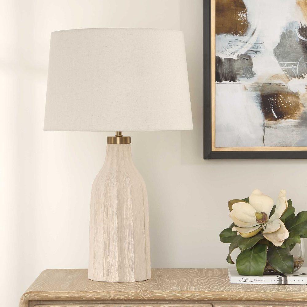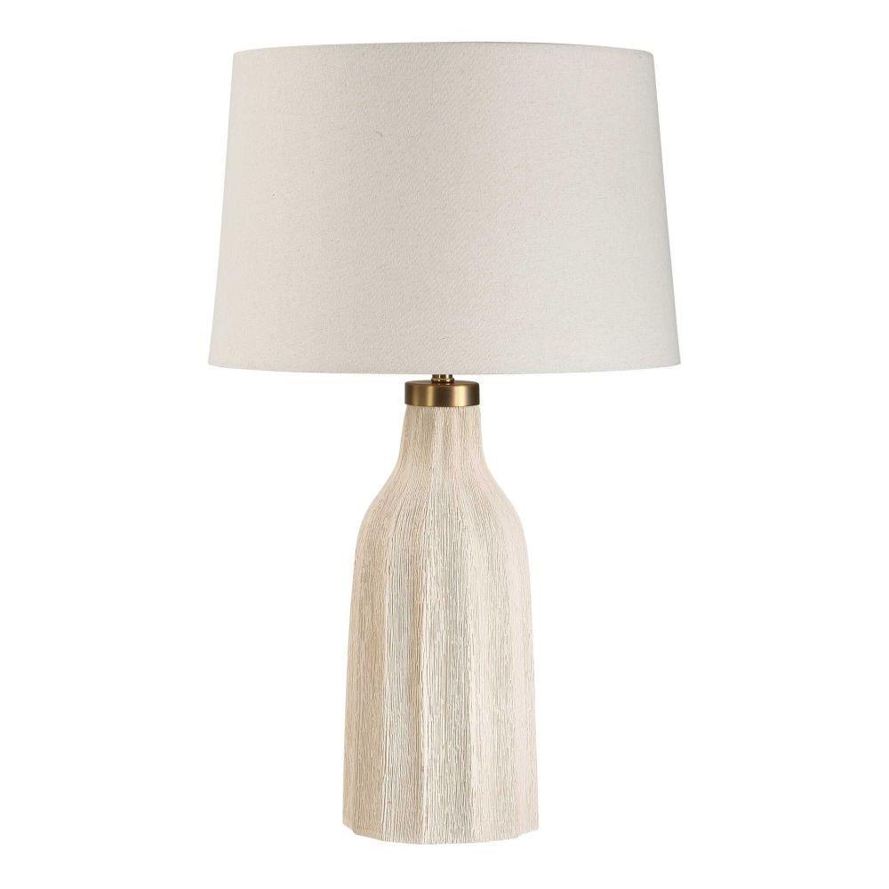 Rugged In Nature, The Maddox Table Lamp Features A Heavily Textured Ceramic Base In A Warm Cream Finish, Accented With Antique Brass Plated Details. The Tapered Round Hardback Shade Is Covered In A Warm White Linen Fabric.