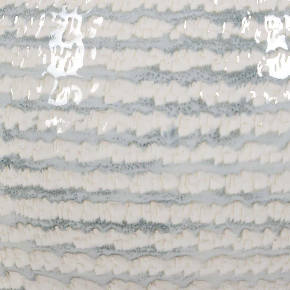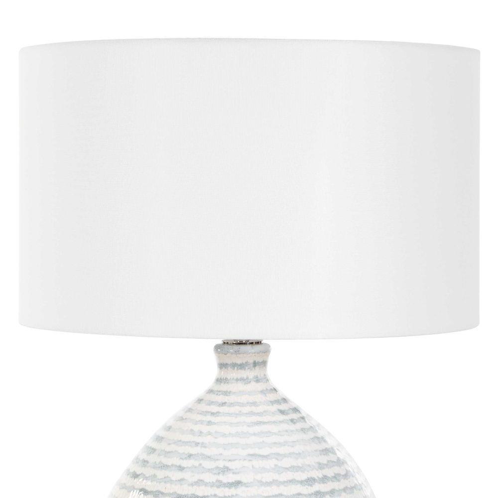 Featuring A Textured, Horizontally Striped Ceramic Base In Soothing White And Gray Tones, The Clary Table Lamp Elegantly Rests On A Clear Crystal Foot, Accented By Antique Brass Plated Details. A Round Hardback Drum Shade Covered In Crisp White Linen Fabric Completes The Look. Due To The Nature Of Fired Glazes On Ceramic Lamps, Finishes Will Vary Slightly.