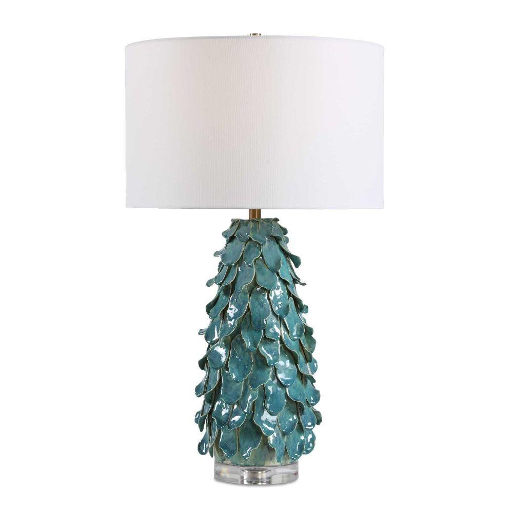 The Mina Table Lamp Showcases A Ceramic Base Meticulously Formed With Individual, Flowing Leaves, Finished With A Captivating Glaze In Blended Shades Of Aged Teal Blue. It Is Elevated By A Thick Crystal Foot And Antique Brass Plated Accents. The Round Hardback Drum Shade Is A Crisp White Linen Fabric. Due To The Nature Of Fired Glazes On Ceramics, Finishes Will Vary Slightly.