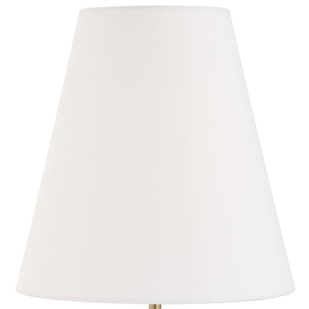 Gloss White Glass Featuring Metallic Smoked Bronze Hues Accented With Antique Brass Plated Details. A Tapered Round Hardback Shade Made With A Crisp White Linen Fabric Completes The Piece.
