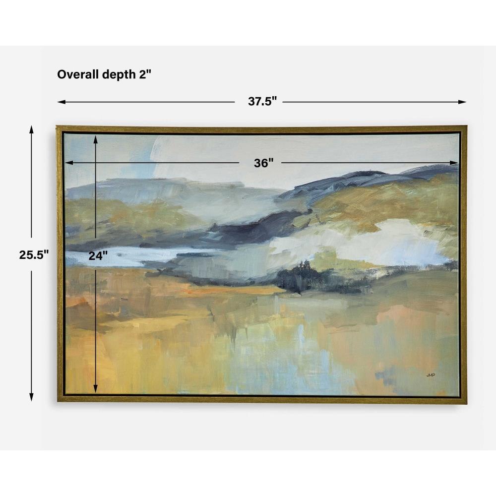 The Folded Hills Framed Canvas Displays An Abstract Landscape In Cool Sky Blue And Honey Yellow. A Solid Wood Gallery Frame With Gold Finish Completes The Artwork. Each Canvas Is Proudly Handcrafted And Printed In The USA. Artwork By Julia Purinton.