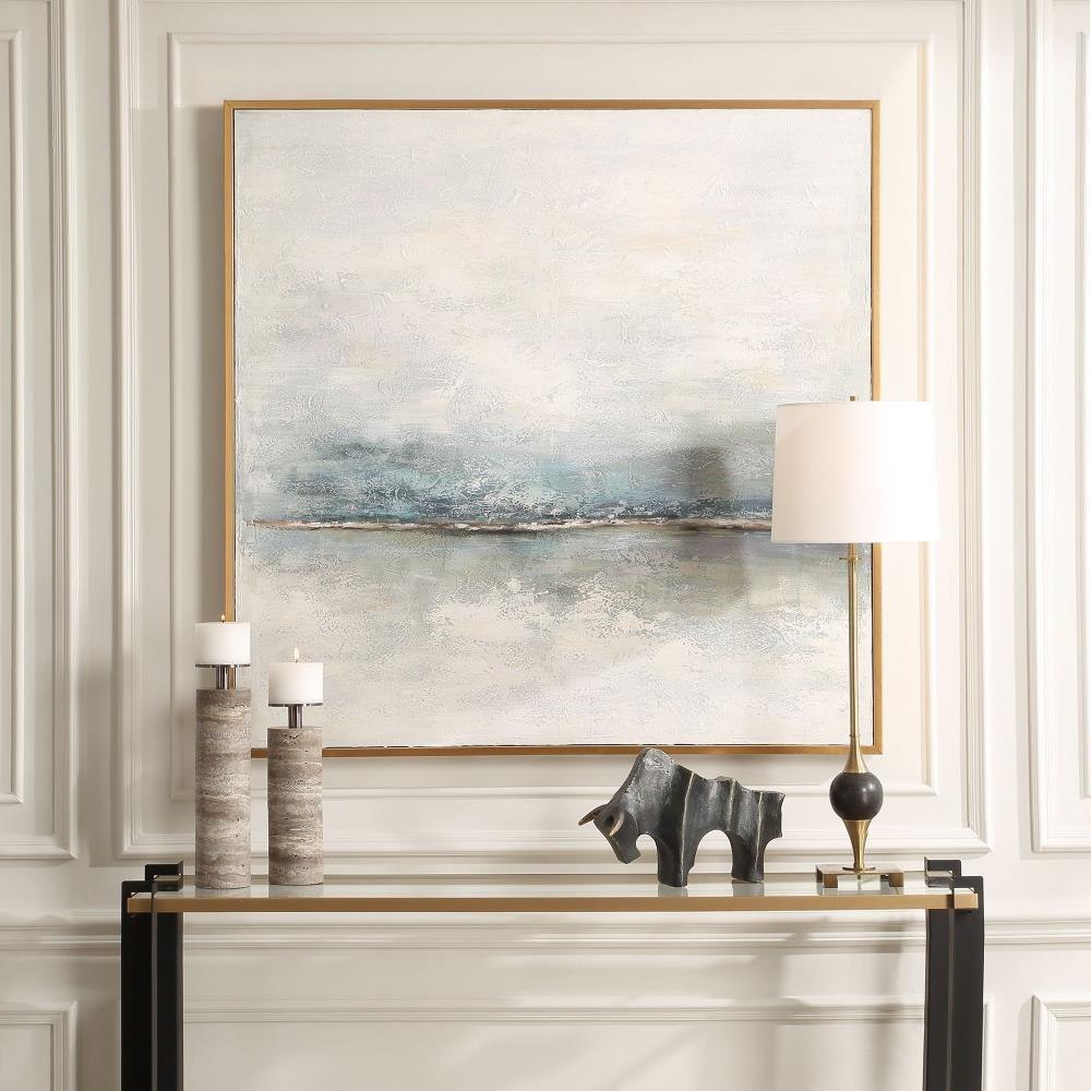 This Hand Painted Abstract On Canvas Transports You To The Perfect Hazy Morning. Featuring Both Cool Shades Of Gray And Blue Layered Together With Warm Hues Of Cream And Brown And Surrounded By A Gold Gallery Frame. Due To The Handcrafted Nature Of This Work, Each Piece May Have Subtle Differences.