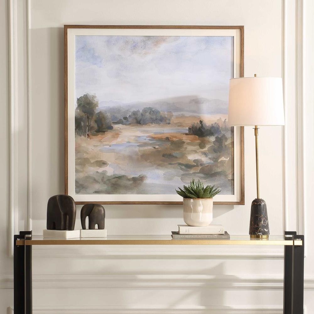 River Afternoon Framed Print Captures A Serene River Landscape In Shades Of Pastel Blue, Olive And Rust, Encased In A Warm Chestnut Frame Accented By An Off-white Linen Liner. Artwork By Danhui Nai.