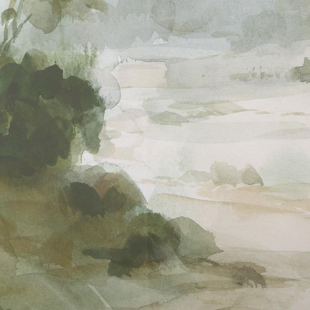 Wander Down The Path Of Verdant Framed Print. Showcasing A Lush Watercolor Landscape With Vibrant Green Hues. The Piece Is Surrounded By A Wood Frame In A Warm Light Oak Finish And Complemented By A Crisp White Double Mat Under Protective Glass. Artwork By Danhui Nai.