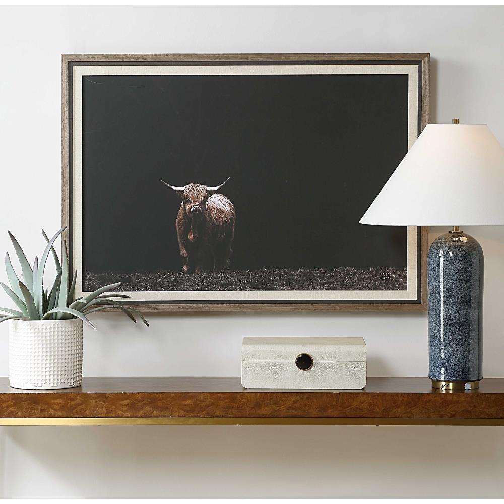 The King Of The Hill Framed Print Features A Captivating Photograph Of A Lone Highland Cow Set Against A Bold Black Background And Complimented By A Rustic Wood Tone Frame And Distressed Black Liner. Its Striking Composition And Dramatic Contrast Make It A Standout Piece, Perfect For Adding A Touch Of Rustic Elegance To Any Space.