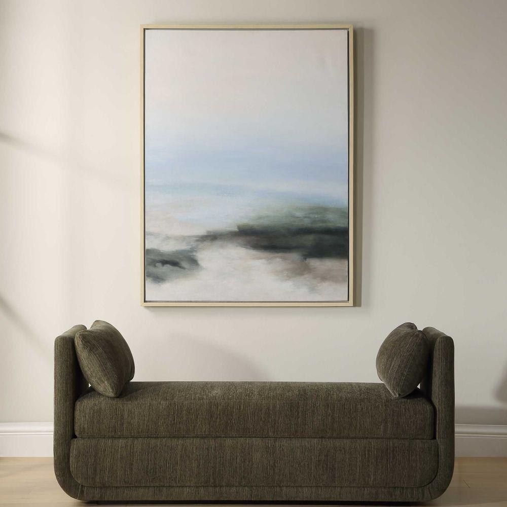 This Serene Hand Painted Artwork Features A Tranquil Blend Of Soft Blues, Grays, And Whites, Evoking A Misty Landscape. Subtle Layering Creates Expansive Depth And A Calming Atmosphere. The Artwork Is Complemented By A Thin Bone White Frame. Due To The Handcrafted Nature Of This Artwork, Each Piece May Have Subtle Differences.